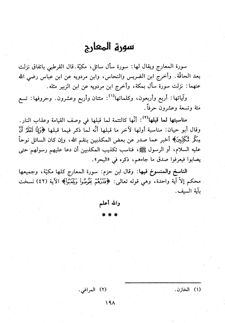 الناسخ والمنسوخ فيها: وقال ابن حزم: سورة المعارج كلها مكيّة، وجميعها محكم إلّا آية واحدة، وهي قوله تعالى: {فَذَرْهُمْ يَخُوضُوا وَيَلْعَبُوا} الآية (42) نسخت بآية السيف.