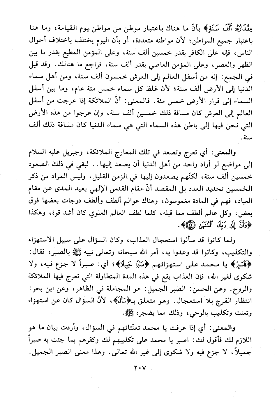 والمعنى: أي تعرج وتصعد في تلك المعارج الملائكة، وجبريل عليه السلام إلى مواضع لو أراد واحد من أهل الدنيا أن يصعد إليها .. لبقي في ذلك الصعود خمسين ألف سنة، لكنّهم يصعدون إليها في الزمن القليل، وليس المراد من ذكر الخمسين تحديد العدد بل المقصد أن مقام القدس الإلهي بعيد المدى عن مقام العباد، فهم في المادة مغموسون، وهناك عوالم ألطف وألطف درجات بعضها فوق بعض، وكل عالم ألطف مما قبله، كلما لطف العالم العلوي كان أشد قوة، وهكذا {وَأَنَّ إِلَى رَبِّكَ الْمُنْتَهَى (42)}.