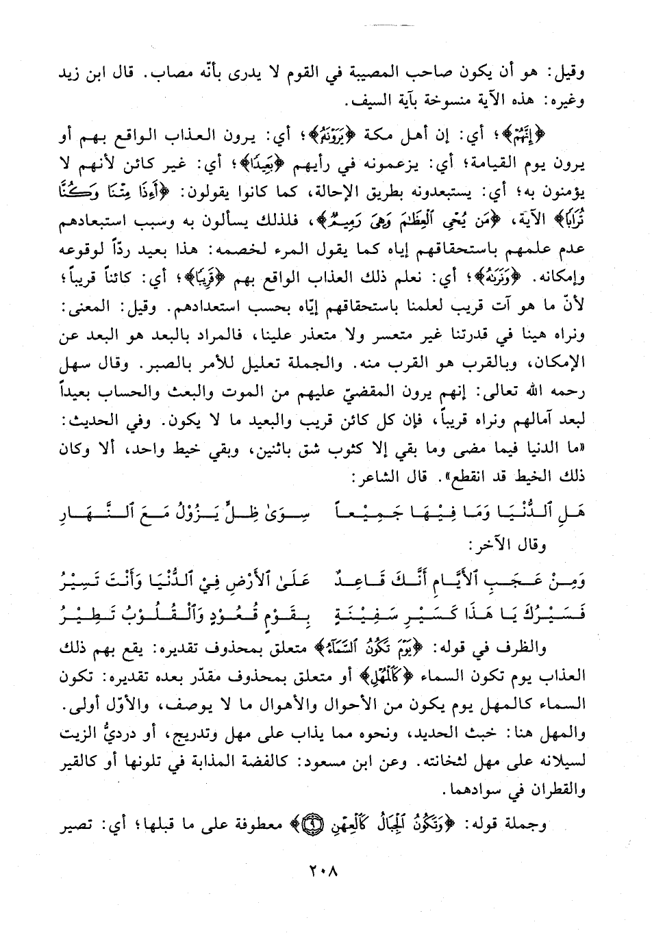 8 - والظرف في قوله: {يَوْمَ تَكُونُ السَّمَاءُ} متعلق بمحذوف تقديره: يقع بهم ذلك العذاب يوم تكون السماء {كَالْمُهْلِ} أو متعلق بمحذوف مقدر بعده تقديره: تكون السماء كالمهل يوم يكون من الأحوال والأهوال ما لا يوصف، والأوّل أولى. والمهل هنا: خبث الحديد، ونحوه مما يذاب على مهل وتدريج، أو درديُّ الزيت لسيلانه على مهل لثخانته. وعن ابن مسعود: كالفضة المذابة في تلونها أو كالقير والقطران في سوادهما.