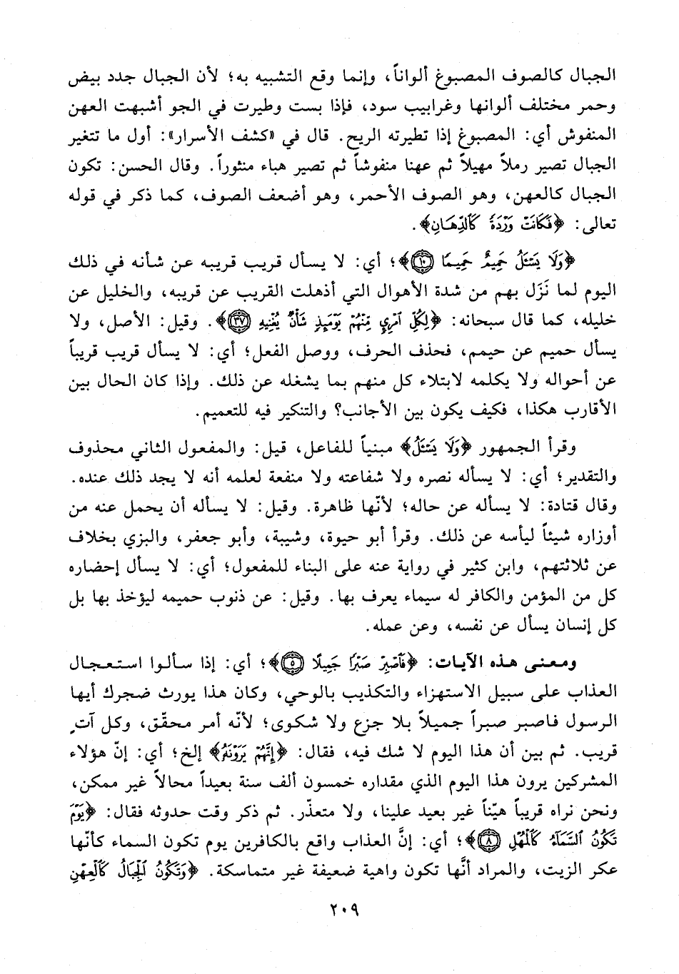 ومعنى هذه الآيات: {فَاصْبِرْ صَبْرًا جَمِيلًا (5)}؛ أي: إذا سألوا استعجال العذاب على سبيل الاستهزاء والتكذيب بالوحي، وكان هذا يورث ضجرك أيها الرسول فاصبر صبرًا جميلًا بلا جزع ولا شكوى؛ لأنّه أمر محقّق، وكل آتٍ قريب. ثم بين أن هذا اليوم لا شك فيه، فقال: {إِنَّهُمْ يَرَوْنَهُ} إلخ؛ أي: إن هؤلاء المشركين يرون هذا اليوم الذي مقداره خمسون ألف سنة بعيدًا محالًا غير ممكن، ونحن نراه قريبًا هيّنًا غير بعيد علينا، ولا متعذّر. ثم ذكر وقت حدوثه فقال: {يَوْمَ تَكُونُ السَّمَاءُ كَالْمُهْلِ (8)}؛ أي: إنَّ العذاب واقع بالكافرين يوم تكون السماء كأنّها عكر الزيت، والمراد أنَّها تكون واهية ضعيفة غير متماسكة. {وَتَكُونُ الْجِبَالُ كَالْعِهْنِ (9)}؛