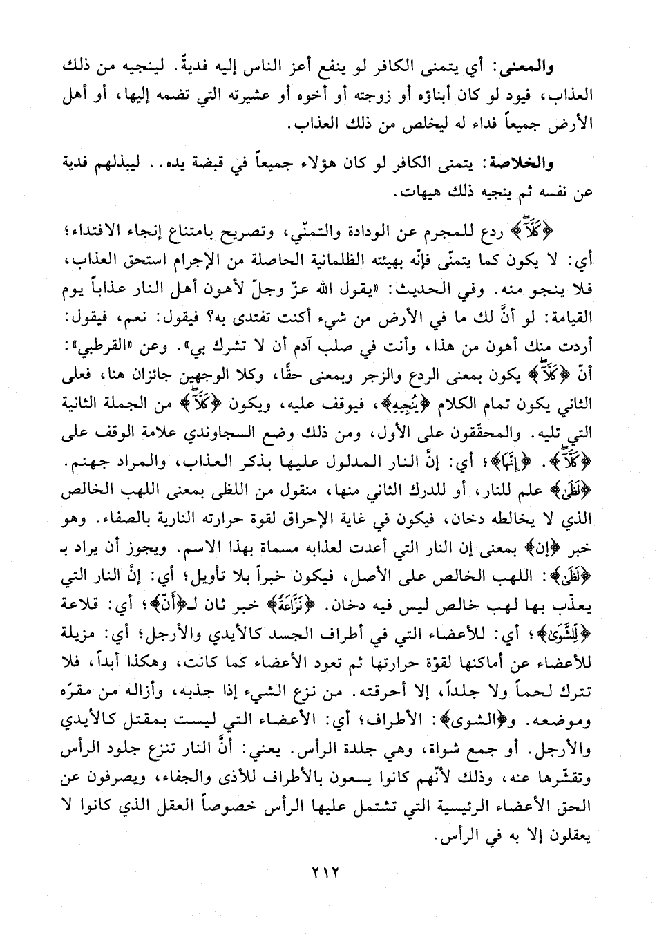 15 - {كَلَّا} ردع للمجرم عن الودادة والتمنّي، وتصريح بامتناع إنجاء الافتداء؛ أي: لا يكون كما يتمنّى فإنّه بهيئته الظلمانية الحاصلة من الإجرام استحق العذاب، فلا ينجو منه. وفي الحديث: "يقول الله عَزَّ وَجَلَّ لأهون أهل النار عذابًا يوم القيامة: لو أنَّ لك ما في الأرض من شيء أكنت تفتدى به؟ فيقول: نعم، فيقول: أردت منك أهون من هذا، وأنت في صلب آدم أن لا تشرك بي". وعن "القرطبي": أن {كَلَّا} يكون بمعنى الردع والزجر وبمعنى حقًّا، وكلا الوجهين جائزان هنا، فعلى الثاني يكون تمام الكلام {يُنْجِيهِ}، فيوقف عليه، ويكون {كَلَّا} من الجملة الثانية التي تليه. والمحققون على الأول، ومن ذلك وضع السجاوندي علامة الوقف على {كَلَّا}. {إِنَّهَا}؛ أي: إنَّ النار المدلولى عليها بذكر العذاب، والمراد جهنم. {لَظَى} علم للنار، أو للدرك الثاني منها، منقول من اللظى بمعنى اللهب الخالص الذي لا يخالطه دخان، فيكون في غاية الإحراق لقوة حرارته النارية بالصفاء. وهو خبر {إن} بمعنى إن النار التي أعدت لعذابه مسماة بهذا الاسم. ويجوز أن يراد بـ {لَظَى}: اللهب الخالص على الأصل، فيكون خبرًا بلا تأويل؛ أي: إنَّ النار التي يعذّب بها لهب خالص ليس فيه دخان.