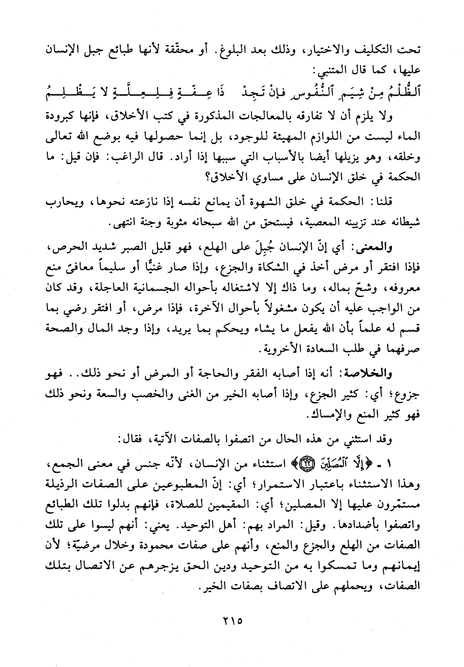 1 - {إِلَّا الْمُصَلِّينَ (22)} استثناء من الإنسان؛ لأنه جنس في معنى الجمع، وهذا الاستثناء باعتبار الاستمرار؛ أي: إنّ المطبوعين على الصفات الرذيلة مستمّرون عليها إلا المصلين؛ أي: المقيمين للصلاة، فإنهم بدلوا تلك الطبائع واتصفوا بأضدادها. وقيل: المراد بهم: أهل التوحيد. يعني: أنهم ليسوا على تلك الصفات من الهلع والجزع والمنع، وأنهم على صفات محمودة وخلال مرضيّة؛ لأن إيمانهم وما تمسكوا به من التوحيد ودين الحق يزجرهم عن الاتصال بتلك الصفات، ويحملهم على الاتصاف بصفات الخير.