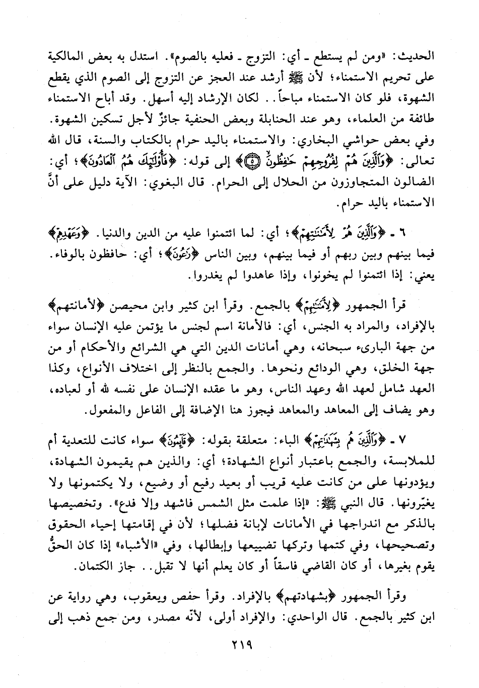 7 - 33 {وَالَّذِينَ هُمْ بِشَهَادَاتِهِمْ} الباء: متعلقة بقوله: {قَائِمُونَ} سواء كانت للتعدية أم للملابسة، والجمع باعتبار أنواع الشهادة؛ أي: والذين هم يقيمون الشهادة، ويؤدونها على من كانت عليه قريب أو بعيد رفيع أو وضيع، ولا يكتمونها ولا يغيّرونها. قال النبي - صلى الله عليه وسلم -: "إذا علمت مثل الشمس فاشهد وإلا فدع". وتخصيصها بالذكر مع اندراجها في الأمانات لإبانة فضلها؛ لأن في إقامتها إحياء الحقوق وتصحيحها، وفي كتمها وتركها تضييعها وابطالها، وفي "الأشباه" إذا كان الحقُّ يقوم بغيرها، أو كان القاضي فاسقًا أو كان يعلم أنها لا تقبل .. جاز الكتمان.