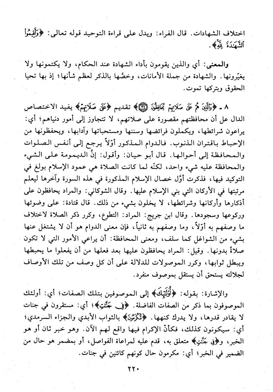 8 - 34 {وَالَّذِينَ هُمْ عَلَى صَلَاتِهِمْ يُحَافِظُونَ (34)} تقديم {عَلَى صَلَاتِهِمْ} يفيد الاختصاص الدال عل أن محافظتهم مقصورة على صلاتهم، لا تتجاوز إلى أمور دنياهم؛ أي: يراعون شرائطها، ويكملون فرائضها وسننها ومستحباتها وآدابها، ويحفظونها من الإحباط باقتران الذنوب. فالدوام المذكور أوّلًا يرجع إلى أنفس الصلوات والمحافظة إلى أحوالها. قال أبو حيان: وأقول: إنَّ الديمومة على الشيء والمحافظة عليه شيء واحد، لكنّه لما كانت الصلاة هي عمود الإِسلام بولغ في التوكيد فيها، فذكرت أوَّل خصال الإِسلام المذكورة في هذه السورة وآخرها ليعلم مرتبتها في الأركان التي بني الإِسلام عليها. وقال الشوكاني: والمراد يحافظون على أذكارها وأركانها وشرائطها، لا يخلون بشيء من ذلك. قال قتادة: على وضوئها وركوعها وسجودها. وقال ابن جريج: المراد: التطوع، وكرر ذكر الصلاة لاختلاف ما وصفهم به أوّلًا، وما وصفهم به ثانيًا، فإن معنى الدوام هو أن لا يشتغل عنها بشيء من الشواغل كما سلف، ومعنى المحافظة: أن يراعي الأمور التي لا تكون صلاةً بدونها. وقيل: المراد يحافظون عليها بعد فعلها من أن يفعلوا ما يحبطها ويبطل ثوابها، وكرر الموصولات للدلالة على أن كل وصف من تلك الأوصاف لجلالته يستحق أن يستقل بموصوف منفرد.