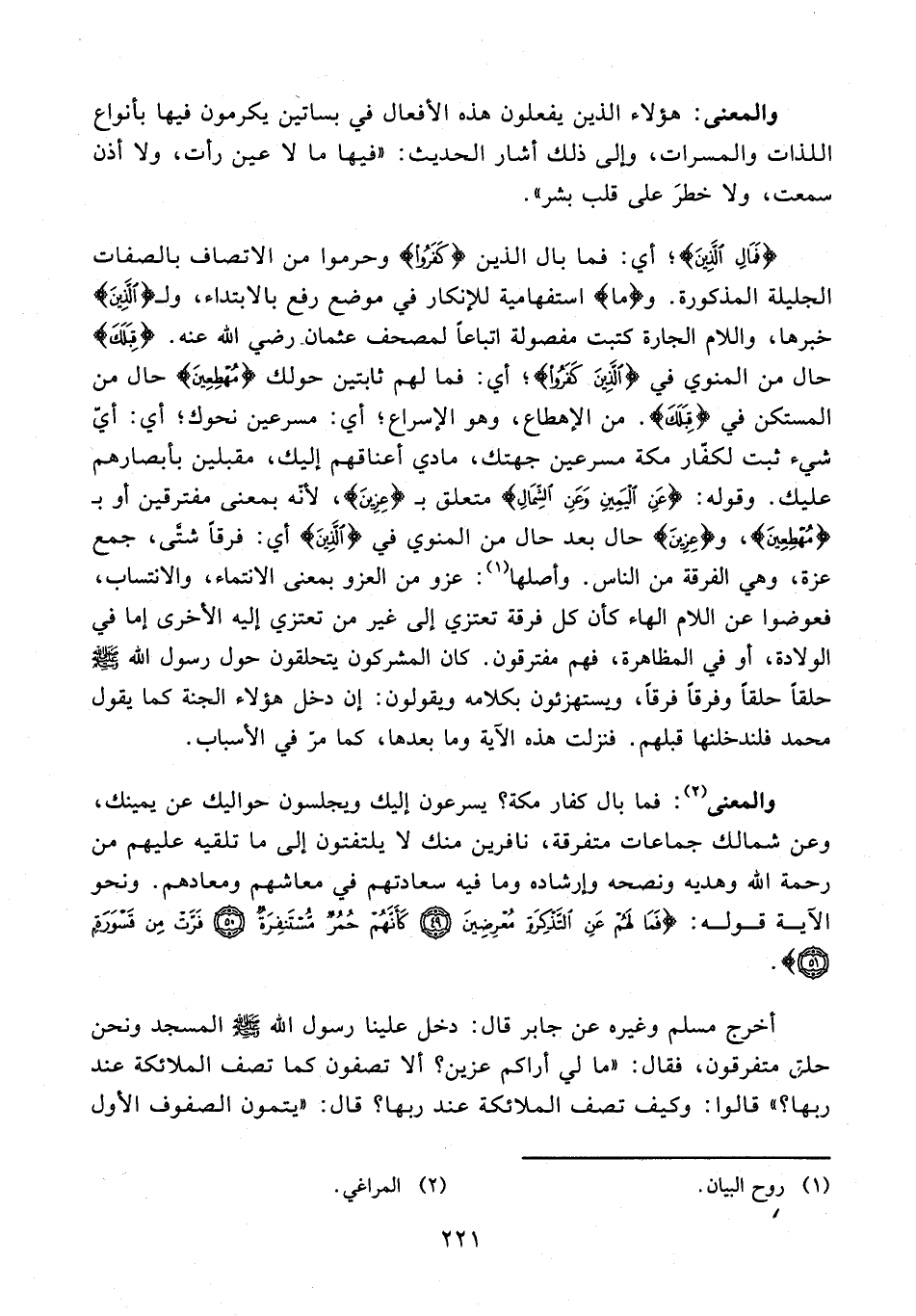 والمعنى (¬2): فما بال كفار مكة؟ يسرعون إليك ويجلسون حواليك عن يمينك، وعن شمالك جماعات متفرقة، نافرين منك لا يلتفتون إلى ما تلقيه عليهم من رحمة الله وهديه ونصحه وإرشاده وما فيه سعادتهم في معاشهم ومعادهم. ونحو الآية قوله: {فَمَا لَهُمْ عَنِ التَّذْكِرَةِ مُعْرِضِينَ (49) كَأَنَّهُمْ حُمُرٌ مُسْتَنْفِرَةٌ (50) فَرَّتْ مِنْ قَسْوَرَةٍ (51)}.