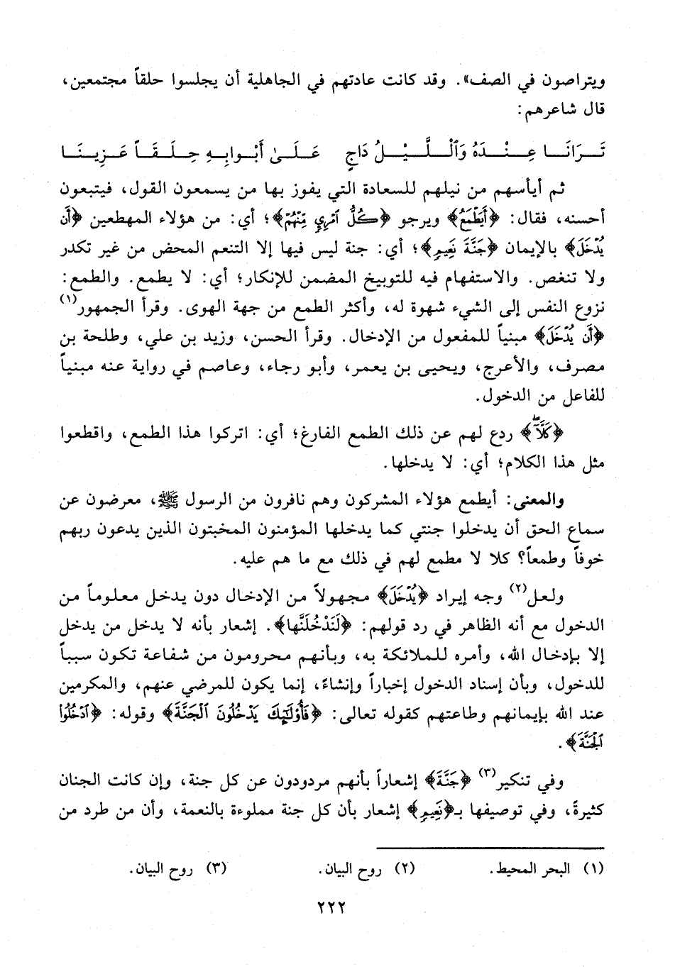 38 - ثم أيأسهم من نيلهم للسعادة التي يفوز بها من يسمعون القول، فيتبعون أحسنه، فقال: {أَيَطْمَعُ} ويرجو {كُلُّ امْرِئٍ مِنْهُمْ}؛ أي: من هؤلاء المهطعين {أَنْ يُدْخَلَ} بالإيمان {جَنَّةَ نَعِيمٍ}؛ أي: جنة ليس فيها إلا التنعم المحض من غير تكدر ولا تنغص. والاستفهام فيه للتوبيخ المضمن للإنكار؛ أي: لا يطمع. والطمع: نزوع النفس إلى الشيء شهوة له، وأكثر الطمع من جهة الهوى. وقرأ الجمهور (¬1) {أَنْ يُدْخَلَ} مبنيًا للمفعول من الإدخال. وقرأ الحسن، وزيد بن علي، وطلحة بن مصرف، والأعرج، ويحيى بن يعمر، وأبو رجاء، وعاصم في رواية عنه مبنيًا للفاعل من الدخول.