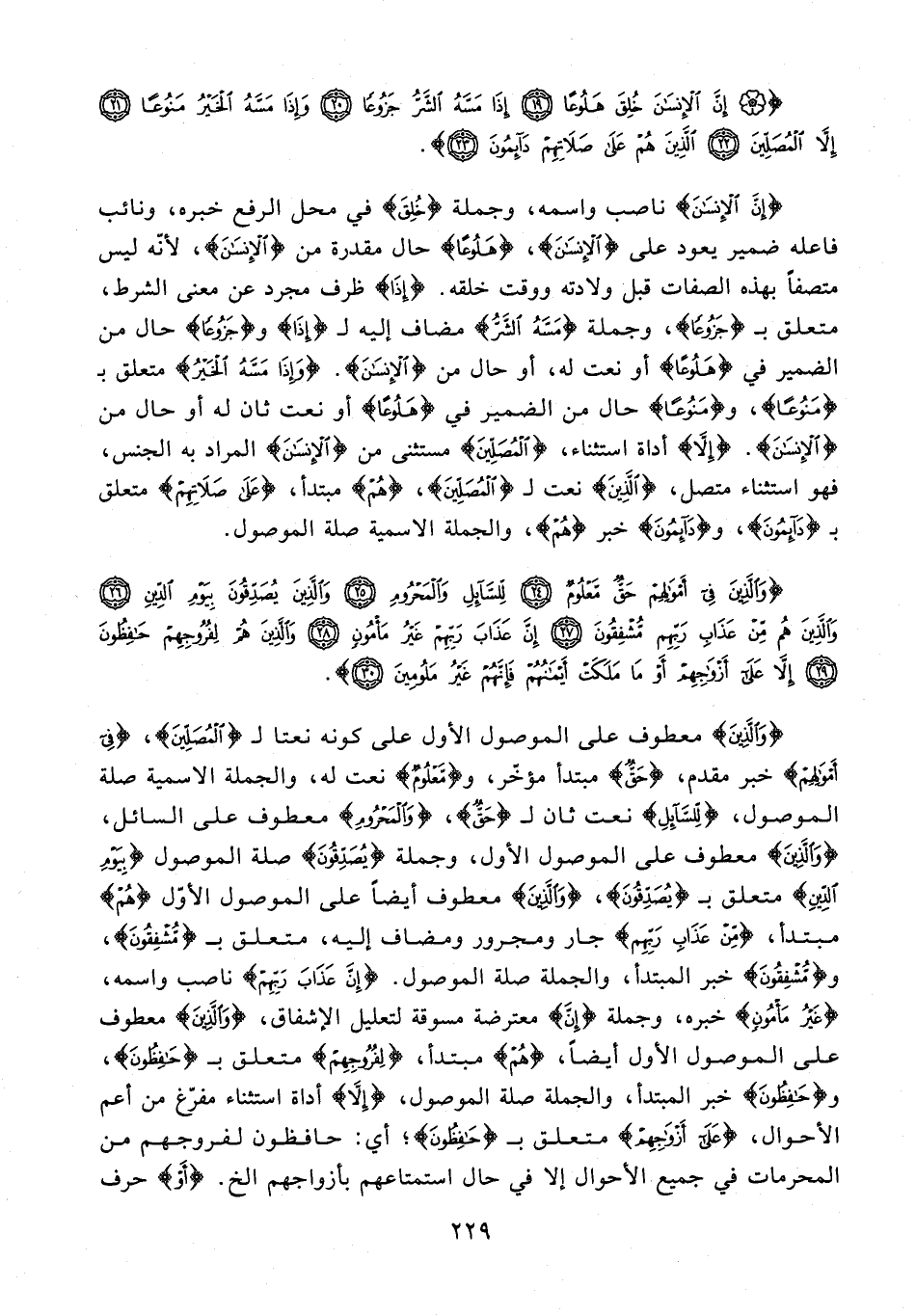 {إِنَّ الْإِنْسَانَ} ناصب واسمه، وجملة {خُلِقَ} في محل الرفع خبره، ونائب فاعله ضمير يعود على {الْإِنْسَانَ}، {هَلُوعًا} حال مقدرة من {الْإِنْسَانَ}؛ لأنه ليس متصفًا بهذه الصفات قبل ولادته ووقت خلقه. {إِذَا} ظرف مجرد عن معنى الشرط، متعلق بـ {جَزُوعًا}، وجملة {مَسَّهُ الشَّرُّ} مضاف إليه لـ {إذَا} و {جَزُوعًا} حال من الضمير في {هَلُوعًا} أو نعت له، أو حال من {الْإِنْسَانَ}. {وَإِذَا مَسَّهُ الْخَيْرُ} متعلق بـ {مَنُوعًا}، و {مَنُوعًا} حال من الضمير في {هَلُوعًا} أو نعت ثان له أو حال من {الْإِنْسَانَ}. {إِلَّا} أداة استثناء، {الْمُصَلِّينَ} مستثنى من {الْإِنْسَانَ} المراد به الجنس، فهو استثناء متصل، {الَّذِينَ} نعت لـ {الْمُصَلِّينَ}، {هُمْ} مبتدأ، {عَلَى صَلَاتِهِمْ} متعلق بـ {دَائِمُونَ}، و {دَائِمُونَ} خبر {هُمْ}، والجملة الاسمية صلة الموصول.