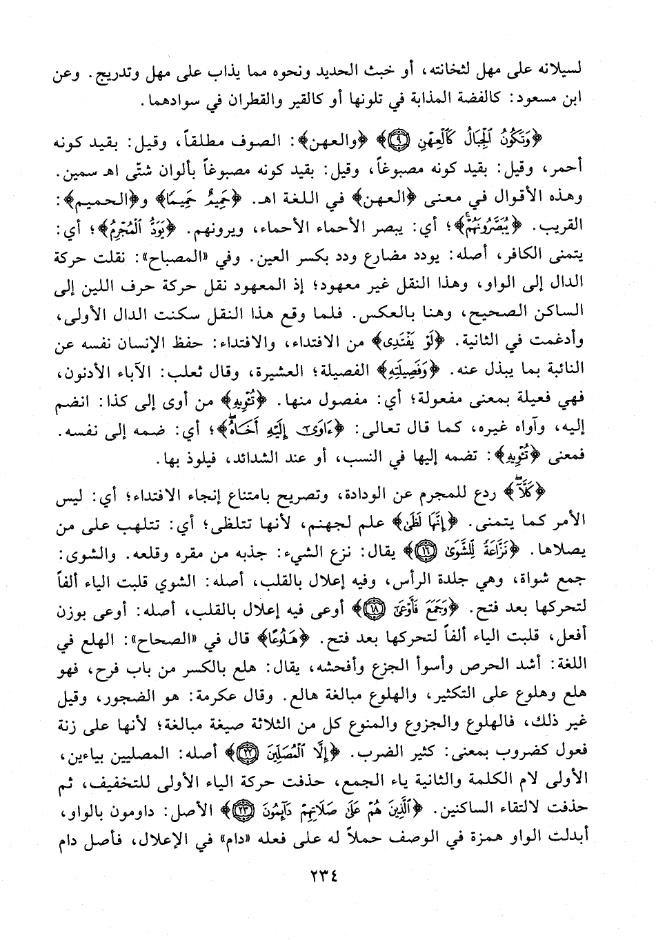 {كَلَّا} ردع للمجرم عن الودادة، وتصريح بامتناع إنجاء الافتداء؛ أي: ليس الأمر كما يتمنى. {إنَهَا لَظَى} علم لجهنم؛ لأنها تتلظى؛ أي: تتلهب على من يصلاها. {نَزَّاعَةً لِلشَّوَى (16)} يقال: نزع الشيء: جذبه من مقره وقلعه. والشوى: جمع شواة، وهي جلدة الرأس، وفيه إعلال بالقلب، أصله: الشوي قلبت الياء ألفًا لتحركها بعد فتح. {وَجَمَعَ فَأَوْعَى (18)} أوعى فيه إعلال بالقلب، أصله: أوعى بوزن أفعل، قلبت الياء ألفًا لتحركها بعد فتح. {هَلُوعًا} قال في "الصحاح": الهلع في اللغة: أشد الحرص وأسوأ الجزع وأفحشه، يقال: هلع بالكسر من باب فرح، فهو هلع وهلوع على التكثير، والهلوع مبالغة هالع. وقال عكرمة: هو الضجور، وقيل غير ذلك، فالهلوع والجزوع والمنوع كل من الثلاثة صيغة مبالغة؛ لأنها على زنة فعول كضروب بمعنى: كثير الضرب. {إِلَّا الْمُصَلِّينَ (22)} أصله: المصليين بياءين، الأولى لام الكلمة والثانية ياء الجمع، حذفت حركة الياء الأولى للتخفيف، ثم حذفت لالتقاء الساكنين. {الَّذِينَ هُمْ عَلَى صَلَاتِهِمْ دَائِمُونَ (23)} الأصل: داومون بالواو، أبدلت الواو همزة في الوصف حملًا له على فعله "دام" في الإعلال، فأصل دام
