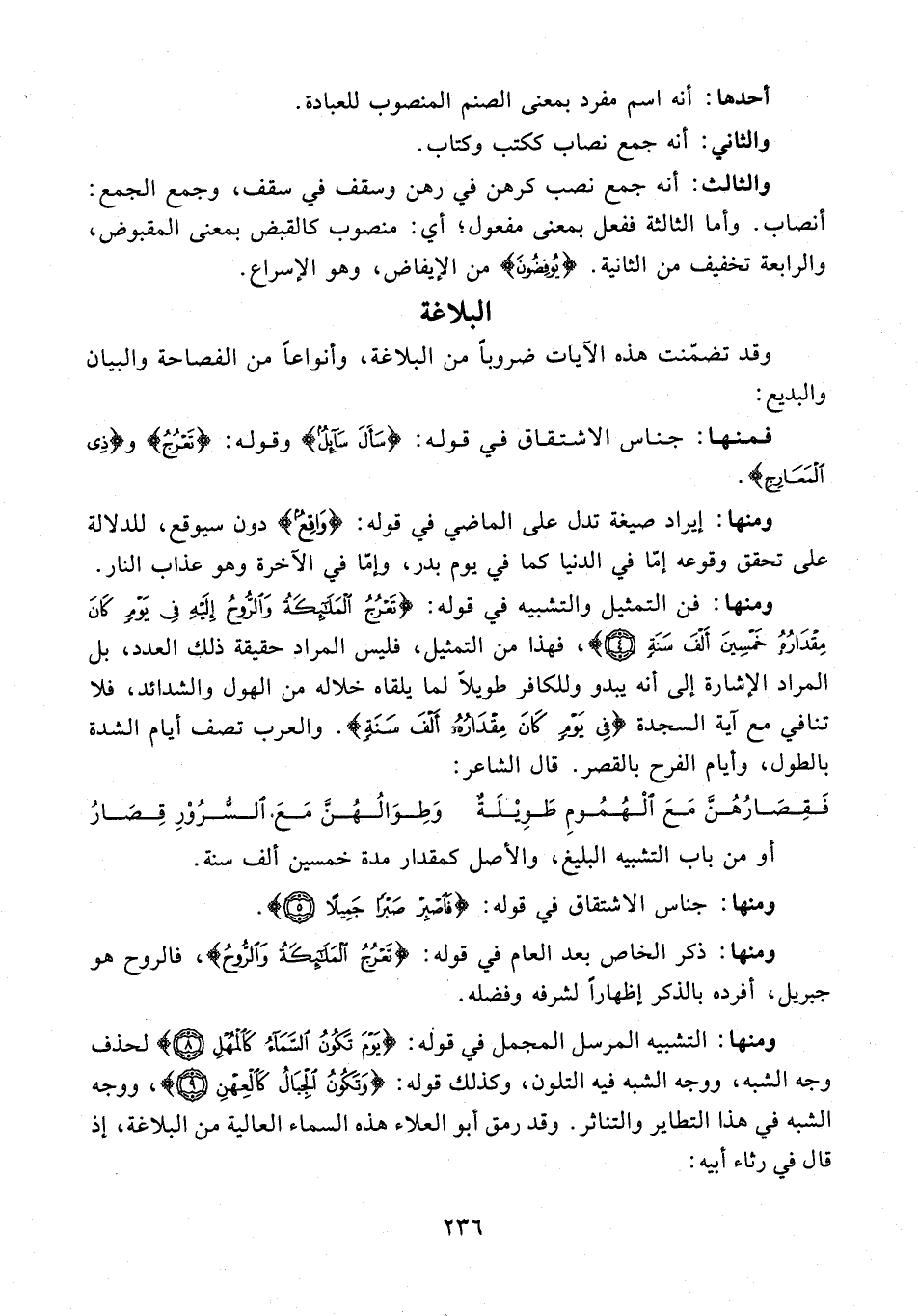 ومنها: فن التمثيل والتشبيه في قوله: {تَعْرُجُ الْمَلَائِكَةُ وَالرُّوحُ إِلَيْهِ فِي يَوْمٍ كَانَ مِقْدَارُهُ خَمْسِينَ أَلْفَ سَنَةٍ (4)}، فهذا من التمثيل، فليس المراد حقيقة ذلك العدد، بل المراد الإشارة إلى أنه يبدو للكافر طويلًا لما يلقاه خلاله من الهول والشدائد، فلا تنافي مع آية السجدة {فِي يَوْمٍ كَانَ مِقْدَارُهُ أَلْفَ سَنَةٍ}. والعرب تصف أيام الشدة بالطول، وأيام الفرح بالقصر. قال الشاعر: