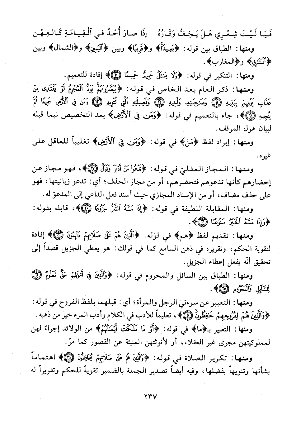 ومنها: ذكر العام بعد الخاص في قوله: {يُبَصَّرُونَهُمْ يَوَدُّ الْمُجْرِمُ لَوْ يَفْتَدِي مِنْ عَذَابِ يَوْمِئِذٍ بِبَنِيهِ (11) وَصَاحِبَتِهِ وَأَخِيهِ (12) وَفَصِيلَتِهِ الَّتِي تُؤْوِيهِ (13) وَمَنْ فِي الْأَرْضِ جَمِيعًا ثُمَّ يُنْجِيهِ (14)}، جاء بالتعميم في قوله: {وَمَنْ فِي الْأَرْضِ} بعد التخصيص فيما قبله لبيان هول الموقف.
