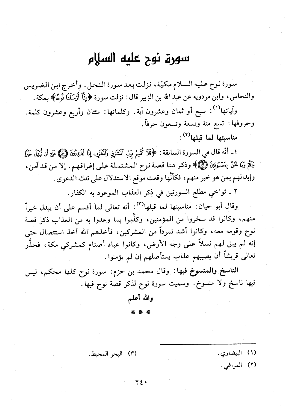 وقال أبو حيان: مناسبتها لما قبلها (¬3): أنه تعالى لما أقسم على أن يبدل خيرًا منهم، وكانوا قد سخروا من المؤمنين، وكذَّبوا بما وعدوا به من العذاب ذكر قصة نوح وقومه معه، وكانوا أشد تمردًا من المشركين، فأخذهم الله أخذ استئصال حتى إنه لم يبق لهم نسلًا على وجه الأرض، وكانوا عباد أصنام كمشركي مكة، فحذَّر تعالى قريشًا أن يصيبهم عذاب يستأصلهم إن لم يؤمنوا.
