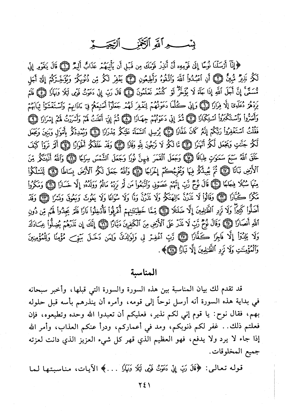 {إِنَّا أَرْسَلْنَا نُوحًا إِلَى قَوْمِهِ أَنْ أَنْذِرْ قَوْمَكَ مِنْ قَبْلِ أَنْ يَأْتِيَهُمْ عَذَابٌ أَلِيمٌ (1) قَالَ يَا قَوْمِ إِنِّي لَكُمْ نَذِيرٌ مُبِينٌ (2) أَنِ اعْبُدُوا اللَّهَ وَاتَّقُوهُ وَأَطِيعُونِ (3) يَغْفِرْ لَكُمْ مِنْ ذُنُوبِكُمْ وَيُؤَخِّرْكُمْ إِلَى أَجَلٍ مُسَمًّى إِنَّ أَجَلَ اللَّهِ إِذَا جَاءَ لَا يُؤَخَّرُ لَوْ كُنْتُمْ تَعْلَمُونَ (4) قَالَ رَبِّ إِنِّي دَعَوْتُ قَوْمِي لَيْلًا وَنَهَارًا (5) فَلَمْ يَزِدْهُمْ دُعَائِي إِلَّا فِرَارًا (6) وَإِنِّي كُلَّمَا دَعَوْتُهُمْ لِتَغْفِرَ لَهُمْ جَعَلُوا أَصَابِعَهُمْ فِي آذَانِهِمْ وَاسْتَغْشَوْا ثِيَابَهُمْ وَأَصَرُّوا وَاسْتَكْبَرُوا اسْتِكْبَارًا (7) ثُمَّ إِنِّي دَعَوْتُهُمْ جِهَارًا (8) ثُمَّ إِنِّي أَعْلَنْتُ لَهُمْ وَأَسْرَرْتُ لَهُمْ إِسْرَارًا (9) فَقُلْتُ اسْتَغْفِرُوا رَبَّكُمْ إِنَّهُ كَانَ غَفَّارًا (10) يُرْسِلِ السَّمَاءَ عَلَيْكُمْ مِدْرَارًا (11) وَيُمْدِدْكُمْ بِأَمْوَالٍ وَبَنِينَ وَيَجْعَلْ لَكُمْ جَنَّاتٍ وَيَجْعَلْ لَكُمْ أَنْهَارًا (12) مَا لَكُمْ لَا تَرْجُونَ لِلَّهِ وَقَارًا (13) وَقَدْ خَلَقَكُمْ أَطْوَارًا (14) أَلَمْ تَرَوْا كَيْفَ خَلَقَ اللَّهُ سَبْعَ سَمَاوَاتٍ طِبَاقًا (15) وَجَعَلَ الْقَمَرَ فِيهِنَّ نُورًا وَجَعَلَ الشَّمْسَ سِرَاجًا (16) وَاللَّهُ أَنْبَتَكُمْ مِنَ الْأَرْضِ نَبَاتًا (17) ثُمَّ يُعِيدُكُمْ فِيهَا وَيُخْرِجُكُمْ إِخْرَاجًا (18) وَاللَّهُ جَعَلَ لَكُمُ الْأَرْضَ بِسَاطًا (19) لِتَسْلُكُوا مِنْهَا سُبُلًا فِجَاجًا (20) قَالَ نُوحٌ رَبِّ إِنَّهُمْ عَصَوْنِي وَاتَّبَعُوا مَنْ لَمْ يَزِدْهُ مَالُهُ وَوَلَدُهُ إِلَّا خَسَارًا (21) وَمَكَرُوا مَكْرًا كُبَّارًا (22) وَقَالُوا لَا تَذَرُنَّ آلِهَتَكُمْ وَلَا تَذَرُنَّ وَدًّا وَلَا سُوَاعًا وَلَا يَغُوثَ وَيَعُوقَ وَنَسْرًا (23) وَقَدْ أَضَلُّوا كَثِيرًا وَلَا تَزِدِ الظَّالِمِينَ إِلَّا ضَلَالًا (24) مِمَّا خَطِيئَاتِهِمْ أُغْرِقُوا فَأُدْخِلُوا نَارًا فَلَمْ يَجِدُوا لَهُمْ مِنْ دُونِ اللَّهِ أَنْصَارًا (25) وَقَالَ نُوحٌ رَبِّ لَا تَذَرْ عَلَى الْأَرْضِ مِنَ الْكَافِرِينَ دَيَّارًا (26) إِنَّكَ إِنْ تَذَرْهُمْ يُضِلُّوا عِبَادَكَ وَلَا يَلِدُوا إِلَّا فَاجِرًا كَفَّارًا (27) رَبِّ اغْفِرْ لِي وَلِوَالِدَيَّ وَلِمَنْ دَخَلَ بَيْتِيَ مُؤْمِنًا وَلِلْمُؤْمِنِينَ وَالْمُؤْمِنَاتِ وَلَا تَزِدِ الظَّالِمِينَ إِلَّا تَبَارًا (28)}.