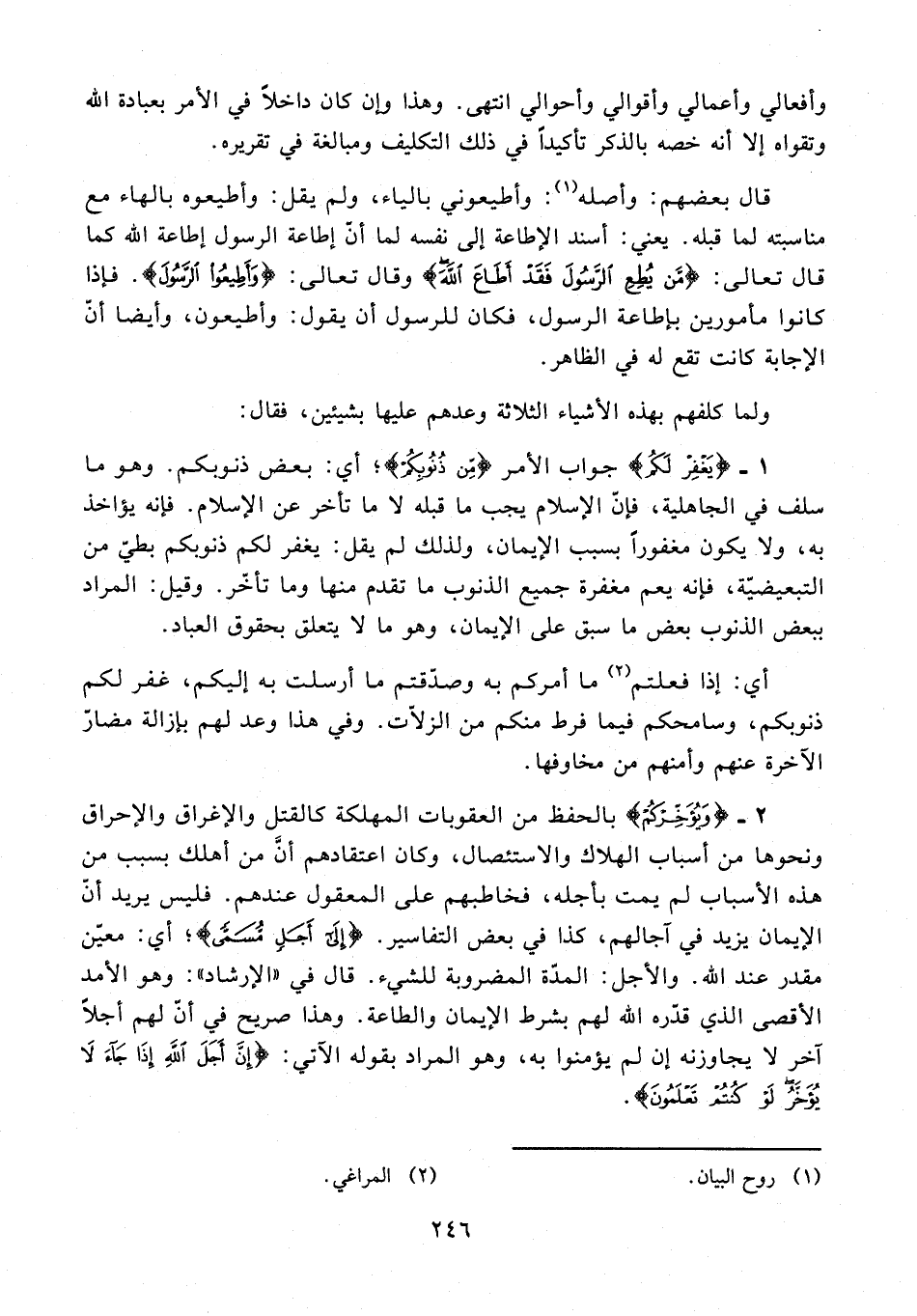 1 - {يَغْفِرْ لَكُمْ} جواب الأمر {مِنْ ذُنُوبِكُمْ}، أي: بعض ذنوبكم. وهو ما سلف في الجاهلية، فإنّ الإِسلام يجب ما قبله لا ما تأخر عن الإِسلام. فإنه يؤاخذ به، ولا يكون مغفورًا بسبب الإيمان، ولذلك لم يقل: يغفر لكم ذنوبكم بطيّ من التبعيضيّة، فإنه يعم مغفرة جميع الذنوب ما تقدم منها وما تأخّر. وقيل: المراد ببعض الذنوب بعض ما سبق على الإيمان، وهو ما لا يتعلق بحقوف العباد.