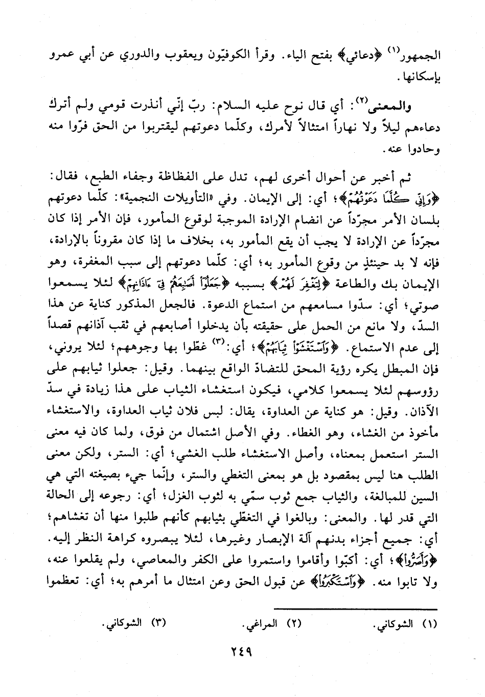 والمعنى (¬2): أي قال نوح عليه السلام: ربّ إنّي أنذرت قومي ولم أترك دعاءهم ليلًا ولا نهارًا امتثالًا لأمرك، وكلّما دعوتهم ليقتربوا من الحق فرّوا منه وحادوا عنه.