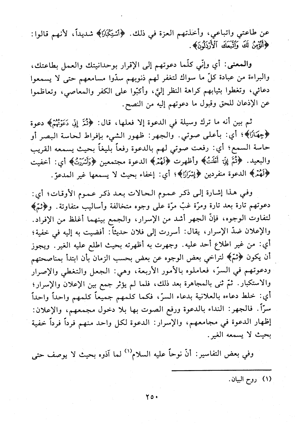 9 - {ثُمَّ إِنِّي أَعْلَنْتُ} وأظهرت {لَهُمْ} الدعوة مجتمعين {وَأَسْرَرتُ} أي: أخفيت {لَهُمْ} الدعوة منفردين {إِسْرَارًا}؛ أي: إخفاء بحيث لا يسمعها غير المدعوّ.