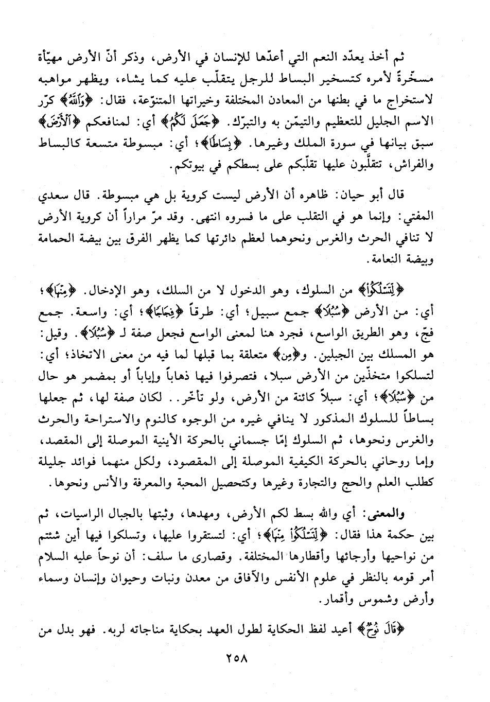 والمعنى: أي والله بسط لكم الأرض، ومهدها، وثبتها بالجبال الراسيات، ثم بين حكمة هذا فقال: {لِتَسْلُكُوا مِنْهَا}؛ أي: لتستقروا عليها، وتسلكوا فيها أين شئتم من نواحيها وأرجائها وأقطارها المختلفة. وقصارى ما سلف: أن نوحًا عليه السلام أمر قومه بالنظر في علوم الأنفس والآفاق من معدن ونبات وحيوان وإنسان وسماء وأرض وشموس وأقمار.