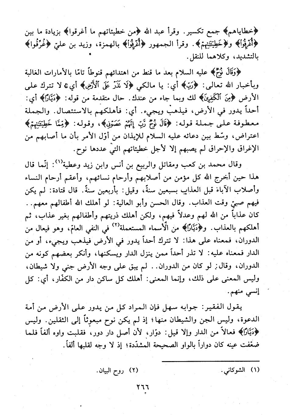 26 - {وَقَالَ نُوحٌ} عليه السلام بعدما قنط من اهتدائهم قنوطًا تامًا بالأمارات الغالبة وبأخبار الله تعالى: {رَبِّ} أي: يا مالكي {لَا تَذَرْ عَلَى الْأَرْضِ} أي لا تترك على الأرض {مِنَ الْكَافِرِينَ} لك وبما جاء من عندك. حال متقدمة من قوله: {دَيَّارًا} أي: أحدًا يدور في الأرض، فيذهب ويجيء. أي: فأهلكهم بالاستئصال. والجملة معطوفة على جملة قوله: {قَالَ نُوحٌ رَبِّ إِنَّهُمْ عَصَوْنِي}، وقوله: {مِمَّا خَطِيئَاتِهِمْ} اعتراض، وسّط بين دعائه عليه السلام للإيذان من أوّل الأمر بأن ما أصابهم من الإغراق والإحراق لم يصبهم إلا لأجل خطيئاتهم التي عددها نوح.