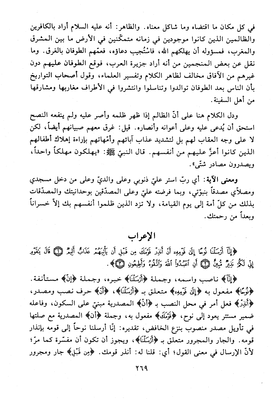 في كل مكان ما اقتضاه وما شاكل معناه. والظاهر: أنه عليه السلام أراد بالكافرين والظالمين الذين كانوا موجودين في زمانه متمكّنين في الأرض ما بين المشرق والمغرب، فمسؤوله أن يهلكهم الله، فاسْتُجيب دعاؤه، فعمّهم الطوفان بالغرق. وما نقل عن بعض المنجمين من أنه أراد جزيرة العرب، فوقع الطوفان عليهم دون غيرهم من الآفاق مخالف لظاهر الكلام وتفسير العلماء، وقول أصحاب التواريخ بأن الناس بعد الطوفان توالدوا وتناسلوا وانتشروا في الأطراف مغاربها ومشارقها من أهل السفينة.