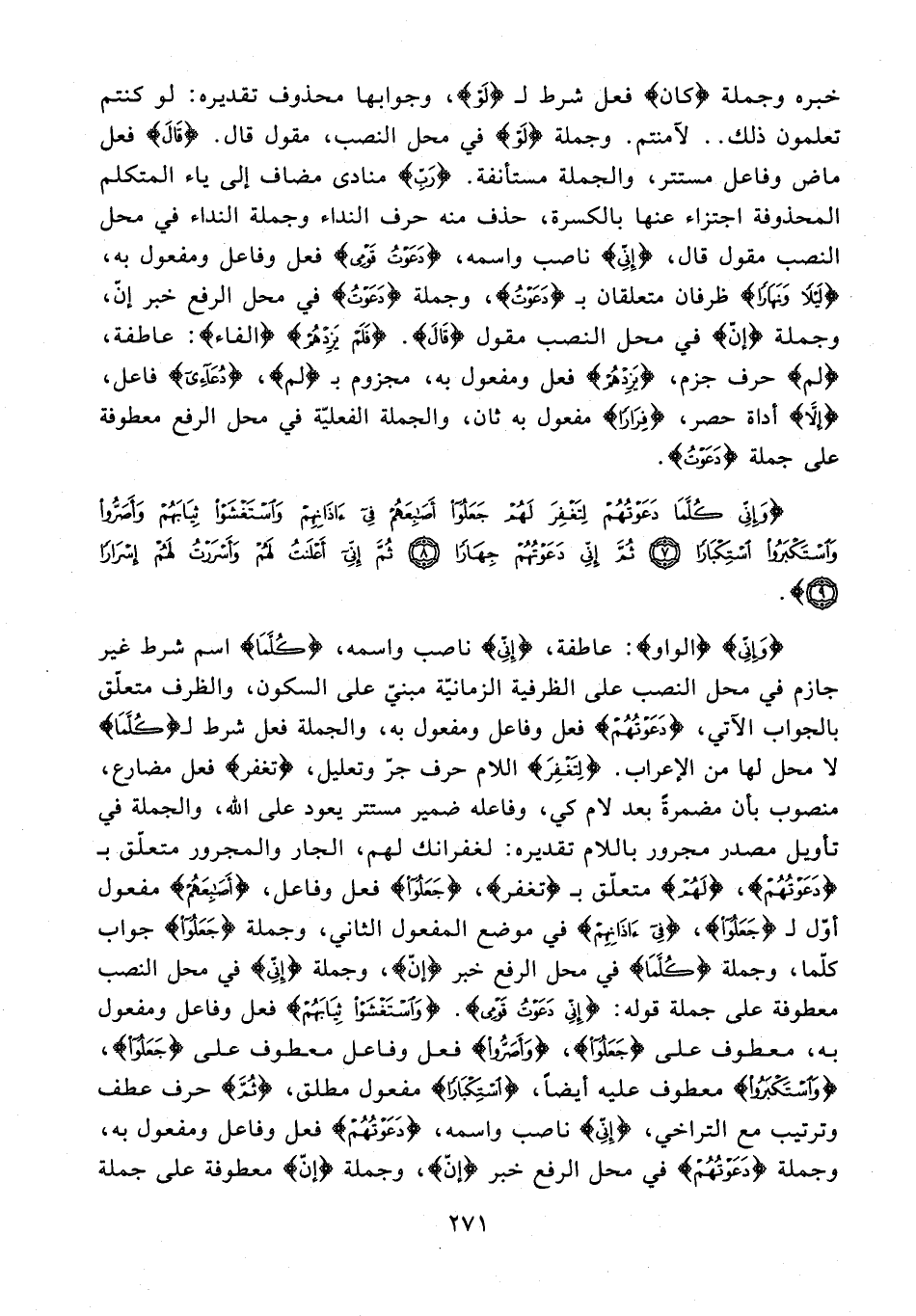 {وَإِنِّي} {الواو}: عاطفة، {وَإِنِّي} ناصب واسمه، {كُلَّمَا} اسم شرط غير جازم في محل النصب على الظرفية الزمانيّة مبنيّ على السكون، والظرف متعلّق بالجواب الآتي، {دَعَوْتُهُمْ} فعل وفاعل ومفعول به، والجملة فعل شرط لـ {كُلَّمَا} لا محل لها من الإعراب. {لِتَغفِرَ} اللام حرف جرّ وتعليل، {تغفر} فعل مضارع، منصوب بأن مضمرةً بعد لام كي، وفاعله ضمير مستتر يعود على الله، والجملة في تأويل مصدر مجرور باللام تقديره: لغفرانك لهم، الجار والمجرور متعلّق بـ {دَعَوْتُهُمْ}، {لَهُمْ} متعلّق بـ {تغفر}، {جَعَلُوا} فعل وفاعل، {أَصَابِعَهُمْ} مفعول أوّل لـ {جَعَلُوا}، {فِي آذَانِهِمْ} في موضع المفعول الثاني، وجملة {جَعَلُوا} جواب كلّما، وجملة {كُلَّمَا} في محل الرفع خبر {إنّ}، وجملة {إِنِّي} في محل النصب معطوفة على جملة قوله: {إِنِّي دَعَوْتُ قَوْمِي}. {وَاسْتَغْشَوْا ثِيَابَهُمْ} فعل وفاعل ومفعول به، معطوف على {جَعَلُوا}، {وَأَصَرُّوا} فعل وفاعل معطوف على {جَعَلُوا}، {وَاسْتَكْبَرُوا} معطوف عليه أيضًا، {اسْتِكْبَارًا} مفعول مطلق، {ثُمَّ} حرف عطف وترتيب مع التراخي، {إِنِّي} ناصب واسمه، {دَعَوْتُهُمْ} فعل وفاعل ومفعول به، وجملة {دَعَوْتُهُمْ} في محل الرفع خبر {إنّ}، وجملة {إنّ} معطوفة على جملة