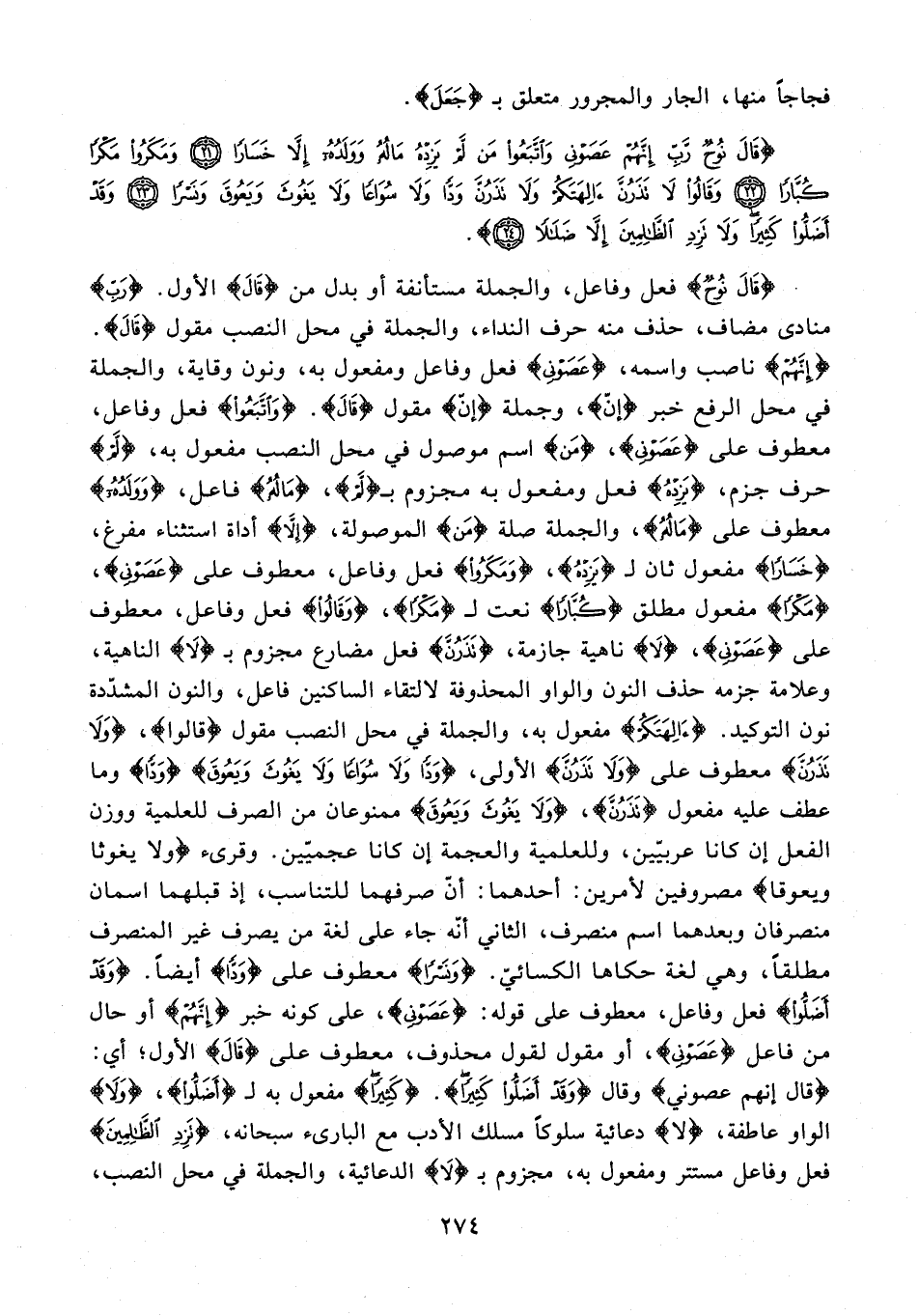 {قَالَ نُوحٌ} فعل وفاعل، والجملة مستأنفة أو بدل من {قَالَ} الأول. {رَبِّ} منادى مضاف، حذف منه حرف النداء، والجملة في محل النصب مقول {قَالَ}. {إِنَّهُمْ} ناصب واسمه، {عَصَوْنِي} فعل وفاعل ومفعول به، ونون وقاية، والجملة في محل الرفع خبر {إنّ}، وجملة {إنّ} مقول {قَالَ}. {وَاتَّبَعُوا} فعل وفاعل، معطوف على {عَصَوْنِي}، {مَن} اسم موصول في محل النصب مفعول به، {لَمْ} حرف جزم، {يَزِدْهُ} فعل ومفعول به مجزوم بـ {لَمْ}، {مَالُهُ} فاعل، {وَوَلَدُهُ} معطوف على {مَالُهُ}، والجملة صلة {مَن} الموصولة، {إِلَّا} أداة استثناء مفرغ، {خَسَارًا} مفعول ثان لـ {يَزِدْهُ}، {وَمَكَرُوا} فعل وفاعل، معطوف على {عَصَوْنِي}، {مَكْرًا} مفعول مطلق {كُبَّارًا} نعت لـ {مَكْرًا}، {وَقَالُوا} فعل وفاعل، معطوف على {عَصَوْنِي}، {لَا} ناهية جازمة، {تَذَرُنَّ} فعل مضارع مجزوم بـ {لَا} الناهية، وعلامة جزمه حذف النون والواو المحذوفة لالتقاء الساكنين فاعل، والنون المشدّدة نون التوكيد. {آلِهَتَكُمْ} مفعول به، والجملة في محل النصب مقول {وَقَالُوا}، {وَلَا تَذَرُنَّ} معطوف على {وَلَا تَذَرُنَّ} الأولى، {وَدًّا وَلَا سُوَاعًا وَلَا يَغُوثَ وَيَعُوقَ} {وَدًّا} وما عطف عليه مفعول {تَذَرُنَّ}، {وَلَا يَغُوثَ وَيَعُوقَ} ممنوعان من الصرف للعلمية ووزن الفعل إن كانا عربيّين، وللعلمية والعجمة إن كانا عجميّين. وقرىء {ولا يغوثا ويعوقا} مصروفين لأمرين: أحدهما: أنّ صرفهما للتناسب، إذ قبلهما اسمان منصرفان وبعدهما اسم منصرف، الثاني أنّه جاء على لغة من يصرف غير المنصرف مطلقًا، وهي لغة حكاها الكسائيّ. {وَنَسْرًا} معطوف على {وَدًّا} أيضًا. {وَقَدْ أَضَلُّوا} فعل وفاعل، معطوف على قوله: {عَصَوْنِي}، على كونه خبر {إِنَّهُمْ} أو حال من فاعل {عَصَوْنِي}، أو مقول لقول محذوف، معطوف على {قَالَ} الأول؛ أي: {قَالَ إِنَّهُمْ عَصَوْنِي} وقال {وَقَدْ أَضَلُّوا كَثِيرًا}. {كَثِيرًا} مفعول به لـ {أَضَلُّوا}، {وَلَا} الواو عاطفة، {لا} دعائية سلوكًا مسلك الأدب مع البارىء سبحانه، {تَزِدِ الظَّالِمِينَ} فعل وفاعل مستتر ومفعول به، مجزوم بـ {لَا} الدعائية، والجملة في محل النصب،