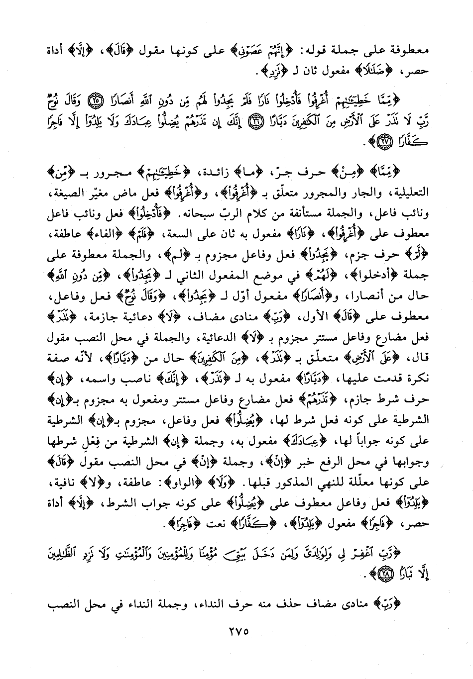 {مِمَّا} {مِنْ} حرف جرّ، {ما} زائدة، {خَطِيئَاتِهِمْ} مجرور بـ {مِنْ} التعليلية، والجار والمجرور متعلّق بـ {أُغْرِقُوا}، و {أُغْرِقُوا} فعل ماض مغيَّر الصيغة، ونائب فاعل، والجملة مستأنفة من كلام الربّ سبحانه. {فَأُدْخِلُوا} فعل ونائب فاعل معطوف على {أُغْرِقُوا}، {نَارًا} مفعول به ثان على السعة، {فَلَم} {الفاء} عاطفة، {لم} حرف جزم، {يَجِدُوا} فعل وفاعل مجزوم بـ {لم}، والجملة معطوفة على جملة {أدخلوا}، {لَهُمْ} في موضع المفعول الثاني لـ {يَجِدُوا}، {مِنْ دُونِ اللَّهِ} حال من أنصارا، و {أَنْصَارًا} مفعول أوّل لـ {يَجِدُوا}، {وَقَالَ نوُحٌ} فعل وفاعل، معطوف على {قَالَ} الأول، {رَبِّ} منادى مضاف، {لَا} دعائية جازمة، {تَذَرْ} فعل مضارع وفاعل مستتر مجزوم بـ {لَا} الدعائية، والجملة في محل النصب مقول قال، {عَلَى الْأَرْضِ} متعلّق بـ {تَذَرْ}، {مِنَ الْكَافِرِينَ} حال من {دَيَّارًا}؛ لأنّه صفة نكرة قدمت عليها، {دَيَّارًا} مفعول به لـ {تَذَرْ}، {إِنَّكَ} ناصب واسمه، {إِن} حرف شرط جازم، {تَذَرْهُمْ} فعل مضارع وفاعل مستتر ومفعول به مجزوم بـ {إِن} الشرطية على كونه فعل شرط لها، {يُضِلُّوا} فعل وفاعل، مجزوم بـ {إِن} الشرطية على كونه جوابًا لها، {عِبَادَكَ} مفعول به، وجملة {إِنّ} الشرطية من فِعْلِ شرطها وجوابها في محل الرفع خبر {إنّ}، وجملة {إنّ} في محل النصب مقول {قَالَ} على كونها معلّلة للنهي المذكور قبلها. {وَلَا} {الواو}: عاطفة، و {لا} نافية، {يَلِدُوا} فعل وفاعل معطوف على {يُضِلُّوا} على كونه جواب الشرط، {إِلَّا} أداة حصر، {فَاجِرًا} مفعول {يَلِدُوا}، {كَفَّارًا} نعت {فَاجِرًا}.