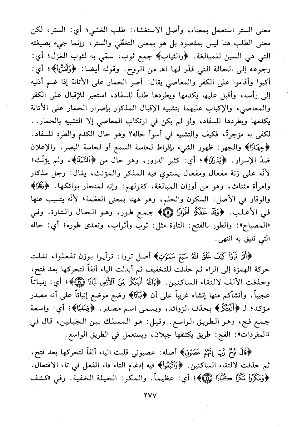 معنى الستر استعمل بمعناه، وأصل الاستغشاء: طلب الغشي؛ أي: الستر، لكن معنى الطلب هنا ليس بمقصود بل هو بمعنى التغطّي والستر، وإنما جيء بصيغته التي هي السين للمبالغة. {والثياب} جمع ثوب، سمّي به لثوب الغزل؛ أي: رجوعه إلى الحالة التي قدّر لها اهـ من الروح. وقوله أيضًا: {وَأَصَرُّوا}؛ أي: أكبوا وأقاموا على الكفر والمعاصي يقال: أصر الحمار على الأتانة إذا ضم أذنيه إلى رأسه، وأقبل عليها يكدمها ويطردها طلبًا للسفاد، استعير للإقبال على الكفر والمعاصي، والإكباب عليهما بتشبيه الإقبال المذكور بإصرار الحمار على الأتانة يكدمها ويطردها للسفاد، ولو لم يكن في ارتكاب المعاصي إلا التشبيه بالحمار .. لكفى به مزجرةً، فكيف والتشبيه في أسوأ حاله؛ وهو حال الكدم والطرد للسفاد. {جِهَارًا} والجهر: ظهور الشيء بإفراط لحاسة السمع أو لحاسة البصر. والإعلان ضدّ الإسرار. {مِدْرَارًا}؛ أي: كثير الدرور، وهو حال من {السَّمَاءَ}، ولم يؤنّث؛ لأنّه على زنة مفعال ومفعال يستوي فيه المذكر والمؤنث، يقال: رجل مذكار وامرأة مئناث، وهو من أوزان المبالغة، كقولهم: وإنه لمنحار بوائكها. {وَقَارًا} والوقار في الأصل: السكون والحلم، وهو هاهنا بمعنى العظمة؛ لأنّه يتسبب عنها في الأغلب. {وَقَدْ خَلَقَكُمْ أَطْوَارًا (14)} جمع طور، وهو الحال والتارة. وفي "المصباح": والطور بالفتح: التارة مثل: ثوب وأثواب، وتعدى طوره؛ أي: حا له التي تليق به انتهى.