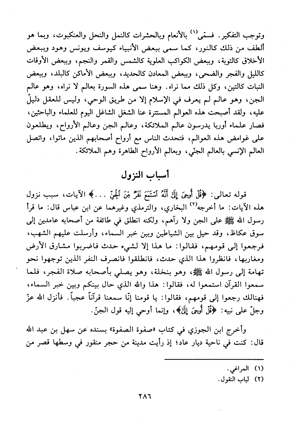 وتوجب التفكير. فسمى (¬1) بالأنعام وبالحشرات كالنمل والنحل والعنكبوت، وبما هو ألطف من ذلك كالنور، كما سمى ببعض الأنبياء كيوسف ويونس وهود وببعض الأخلاق كالتوبة، وببعض الكواكب العلوية كالشمس والقمر والنجم، وببعض الأوقات كالليل والفجر والضحى، وببعض المعادن كالحديد، وببعض الأماكن كالبلد، وببعض النبات كالتين، وكل ذلك مما نراه. وهنا سمى هذه السورة بعالم لا نراه، وهو عالم الجن، وهو عالم لم يعرف في الإِسلام إلا من طريق الوحي، وليس للعقل دليلٌ عليه، ولقد أصبحت هذه العوالم المستترة عنا الشغل الشاغل اليوم للعلماء والباحثين، فصار علماء أوربا يدرسون عالم الملائكة، وعالم الجن وعالم الأرواح، ويطلعون على غوامض هذه العوالم، فتحدث الناس مع أرواح أصحابهم الذين ماتوا، واتصل العالم الإنسي بالعالم الجنّي، وبعالم الأرواح الطاهرة وهم الملائكة.