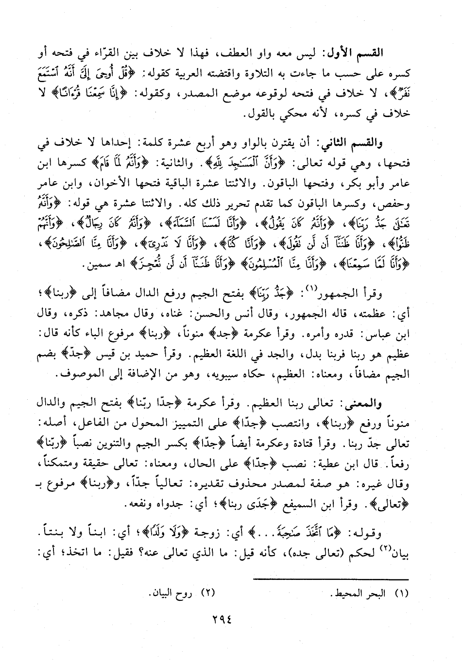 والقسم الثاني: أن يقترن بالواو وهو أربع عشرة كلمة: إحداها لا خلاف في فتحها، وهي قوله تعالى: {وَأَنَّ الْمَسَاجِدَ لِلَّهِ}. والثانية: {وَأَنَّهُ لَمَّا قَامَ} كسرها ابن عامر وأبو بكر، وفتحها الباقون. والاثنتا عشرة الباقية فتحها الأخوان، وابن عامر وحفص، وكسرها الباقون كما تقدم تحرير ذلك كله. والاثنتا عشرة هي قوله: {وَأَنَّهُ تَعَالَى جَدُّ رَبِّنَا}، {وَأَنَّهُ كَانَ يَقُولُ}، {وَأَنَّا لَمَسْنَا السَّمَاءَ}، {وَأَنَّهُ كَانَ رِجَالٌ}، {وَأَنَّهُمْ ظَنُّوا}، {وَأَنَّا ظَنَنَّا أَنْ لَنْ تَقُولَ}، {وَأَنَّا كُنَّا}، {وَأَنَّا لَا نَدْرِي}، {وَأَنَّا مِنَّا الصَّالِحُون}، {وَأَنَّا لَمَّا سَمِعْنَا}، {وَأَنَّا مِنَّا الْمُسْلِمُونَ} {وَأَنَّا ظَنَنَّا أَنْ لَنْ نُعْجِزَ} اهـ اسمين.