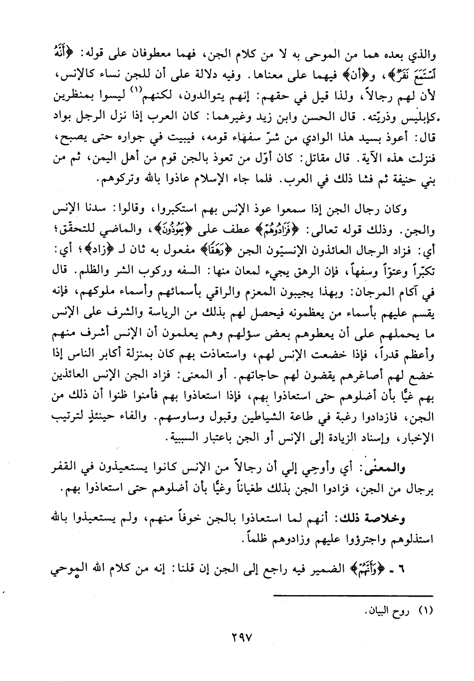 والذي بعده هما من الموحى به لا من كلام الجن، فهما معطوفان على قوله: {أَنَّهُ اسْتَمَعَ}، و {أن} فيهما على معناها. وفيه دلالة على أن للجن نساء كالإنس، لأن لهم رجالًا، ولذا قيل في حقهم: إنهم يتوالدون، لكنهم (¬1) ليسوا بمنظرين كإبليس وذريته. قال الحسن وابن زيد وغيرهما: كان العرب إذا نزل الرجل بواد قال: أعوذ بسيد هذا الوادي من شرّ سفهاء قومه، فيبيت في جواره حتى يصبح، فنزلت هذه الآية. قال مقاتل: كان أوّل من تعوذ بالجن قوم من أهل اليمن، ثم من بني حنيفة ثم فشا ذلك في العرب. فلما جاء الإِسلام عاذوا بالله وتركوهم.