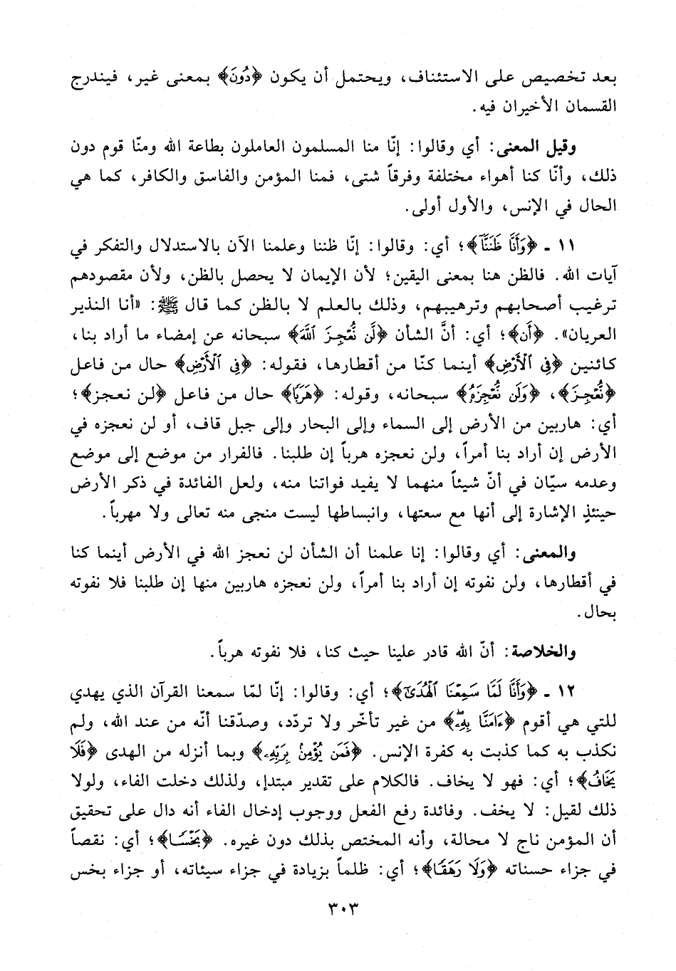 11 - 12 {وَأَنَّا ظَنَنَّا}؛ أي: وقالوا: إنّا ظننا وعلمنا الآن بالاستدلال والتفكر في آيات الله. فالظن هنا بمعنى اليقين؛ لأن الإيمان لا يحصل بالظن، ولأن مقصودهم ترغيب أصحابهم وترهيبهم، وذلك بالعلم لا بالظن كما قال - صلى الله عليه وسلم -: "أنا النذير العريان". {أَن}؛ أي: أنَّ الشأن {لَنْ نُعْجِزَ اللَّهَ} سبحانه عن إمضاء ما أراد بنا، كائنين {فِي الْأَرْضِ} أينما كنّا من أقطارها، فقوله: {فِي الْأَرْضِ} حال من فاعل {نُعْجِزَ}، {وَلَنْ نُعْجِزَهُ} سبحانه، وقوله: {هَرَبًا} حال من فاعل {لَنْ نُعْجِزَ}؛ أي: هاربين من الأرض إلى السماء وإلى البحار وإلى جبل قاف، أو لن نعجزه في الأرض إن أراد بنا أمرًا، ولن نعجزه هربًا إن طلبنا. فالفرار من موضع إلى موضع وعدمه سيّان في أنّ شيئًا منهما لا يفيد فواتنا منه، ولعل الفائدة في ذكر الأرض حينئذٍ الإشارة إلى أنها مع سعتها، وانبساطها ليست منجى منه تعالى ولا مهربًا.