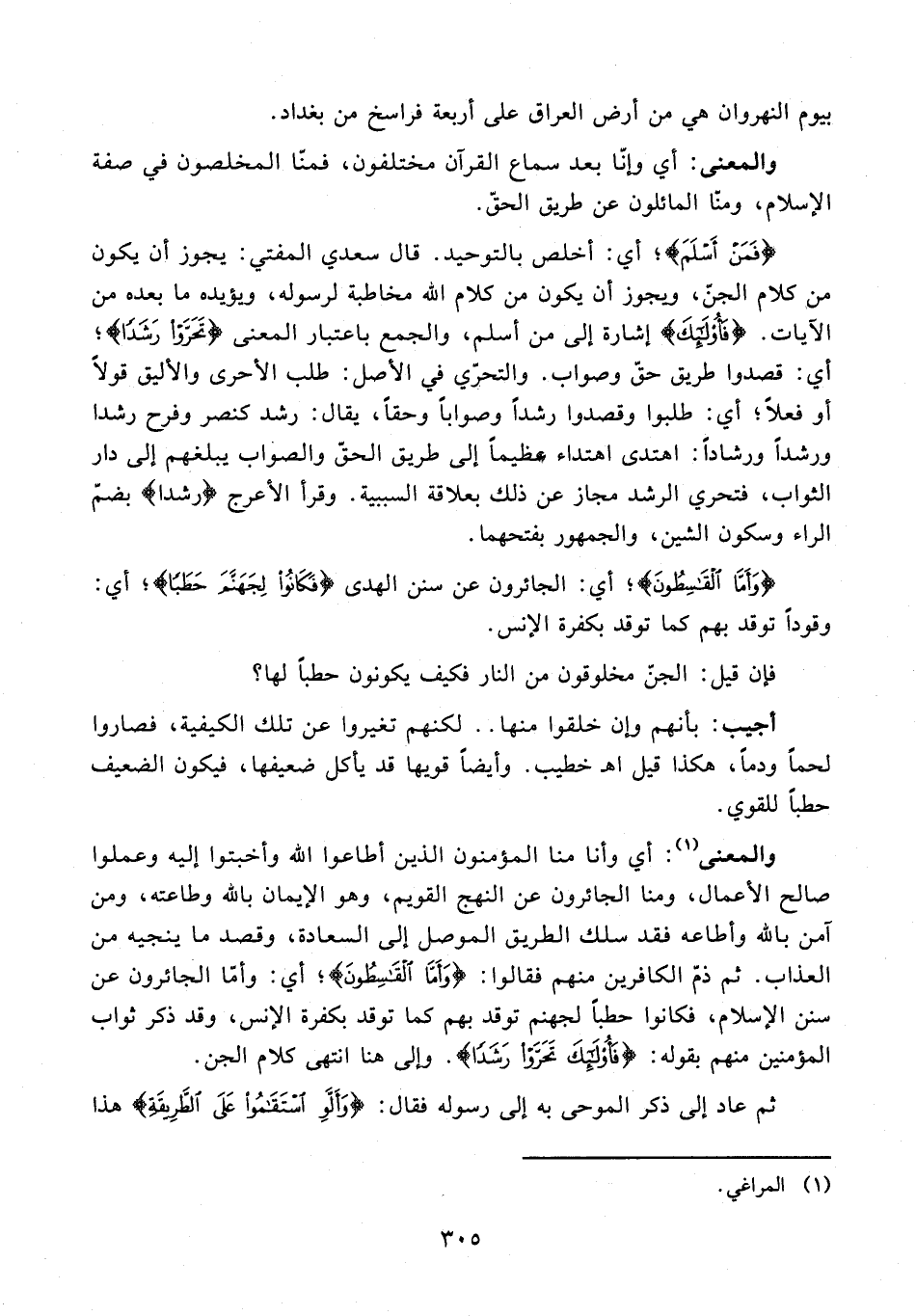 والمعنى (¬1): أي وأنا منا المؤمنون الذين أطاعوا الله وأخبتوا إليه وعملوا صالح الأعمال، ومنا الجائرون عن النهج القويم، وهو الإيمان بالله وطاعته، ومن آمن بالله وأطاعه فقد سلك الطريق الموصل إلى السعادة، وقصد ما ينجيه من العذاب. ثم ذمّ الكافرين منهم فقالوا: {وَأَمَّا الْقَاسِطُونَ}؛ أي: وأمّا الجائرون عن سنن الإِسلام، فكانوا حطبًا لجهنم توقد بهم كما توقد بكفرة الإنس، وقد ذكر ثواب المؤمنين منهم بقوله: {فَأُولَئِكَ تَحَرَّوْا رَشَدًا}. وإلى هنا انتهى كلام الجن.