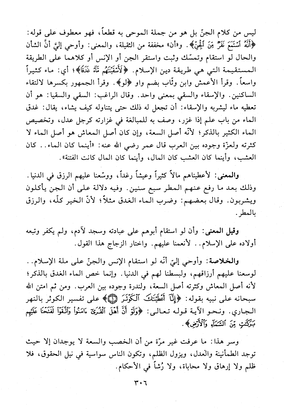 والخلاصة: وأوحي إليّ أنّه لو استقام الإنس والجنّ على ملة الإِسلام .. لوسعنا عليهم أرزاقهم، ولبسطنا لهم في الدنيا. وإنما خص الماء الغدق بالذكر؛ لأنه أصل المعاش وكثرته أصل السعة، ولندرة وجوده بين العرب. ومن ثم امتن الله سبحانه على نبيه بقوله: {إِنَّا أَعْطَيْنَاكَ الْكَوْثَرَ (1)} على تفسير الكوثر بالنهر البخاري. ونحو الآية قوله تعالى: {وَلَوْ أَنَّ أَهْلَ الْقُرَى آمَنُوا وَاتَّقَوْا لَفَتَحْنَا عَلَيْهِمْ بَرَكَاتٍ مِنَ السَّمَاءِ وَالْأَرْضِ}.