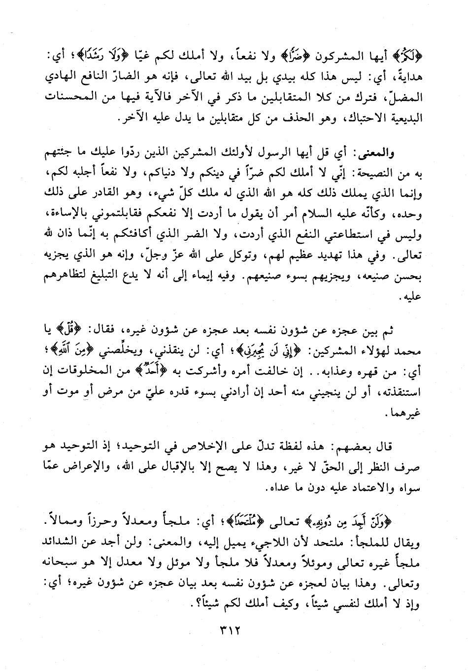 22 - ثم بين عجزه عن شؤون نفسه بعد عجزه عن شؤون غيره، فقال: {قُلْ} يا محمد لهؤلاء المشركين: {إِنِّي لَنْ يُجِيرَنِي}؛ أي: لن ينقذني، ويخلِّصني {مِنَ اللَّهِ}؛ أي: من قهره وعذابه .. إن خالفت أمره وأشركت به {أَحَدٌ} من المخلوقات إن استنقذته، أو لن ينجيني منه أحد إن أرادني بسوء قدره عليّ من مرض أو موت أو غيرهما.