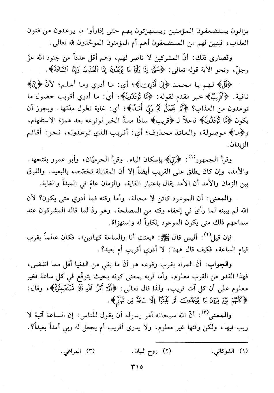 25 - {قُلْ} لهم يا محمد {إِنْ أَدْرِي}؛ أي: ما أدري وما أعلم؛ لأنّ {إِنْ} نافية. {أَقَرِيبٌ} خبر مقدم لقوله: {مَا تُوعَدُونَ}؛ أي: ما أدري أقريب حصول ما توعدون من العذاب؟ {أَمْ يَجْعَلُ لَهُ رَبِّي أَمَدًا}؛ أي: غاية تطول مدّتها. ويجوز أن يكون {مَا تُوعَدُونَ} فاعلًا لـ {قريب} سادًّا مسدَّ الخبر لوقوعه بعد همزة الاستفهام، و {ما} موصولة، والعائد محذوف؛ أي: أقريب الذي توعدونه، نحو: أقائم الزيدان.