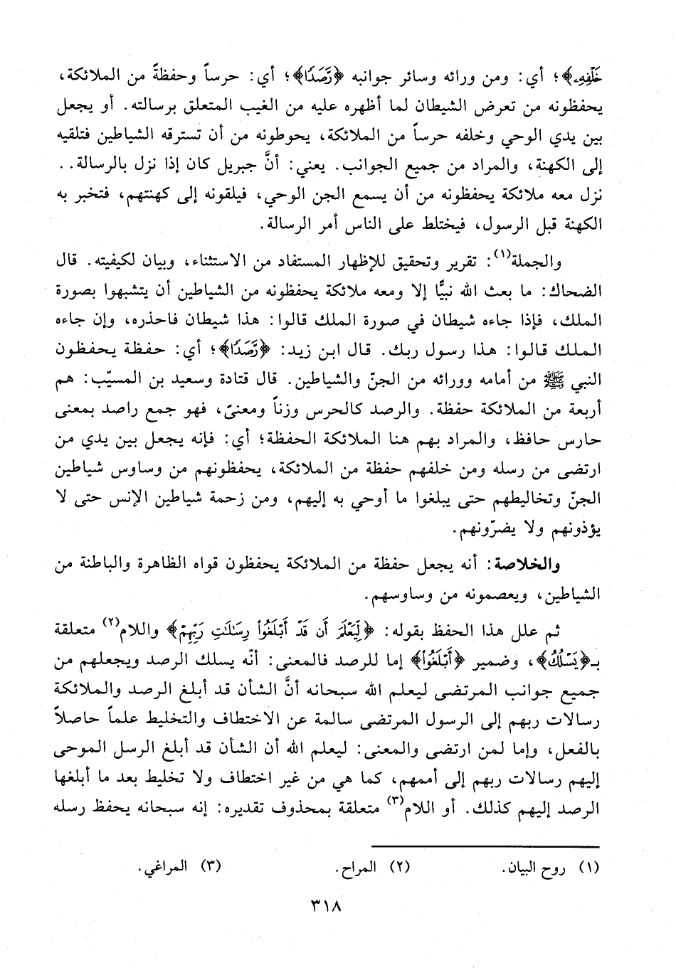 والجملة (¬1): تقرير وتحقيق للإظهار المستفاد من الاستثناء، وبيان لكيفيته. قال الضحاك: ما بعث الله نبيًّا إلا ومعه ملائكة يحفظونه من الشياطين أن يتشبهوا بصورة الملك، فإذا جاءه شيطان في صورة الملك قالوا: هذا شيطان فاحذره، وإن جاءه الملك قالوا: هذا رسول ربك. قال ابن زيد: {رَصَدًا}؛ أي: حفظة يحفظون النبي - صلى الله عليه وسلم - من أمامه وورائه من الجنّ والشياطين. قال قتادة وسعيد بن المسيّب: هم أربعة من الملائكة حفظة. والرصد كالحرس وزنًا ومعنًى، فهو جمع راصد بمعنى حارس حافظ، والمراد بهم هنا الملائكة الحفظة؛ أي: فإنه يجعل بين يدي من ارتضى من رسله ومن خلفهم حفظة من الملائكة، يحفظونهم من وساوس شياطين الجن وتخاليطهم حتى يبلغوا ما أوحي به إليهم، ومن زحمة شياطين الإنس حتى لا يؤذونهم ولا يضرّونهم.