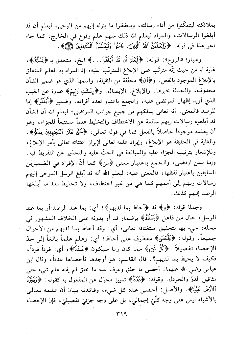 وعبارة "الروح": قوله: {لِيَعْلَمَ أَنْ قَدْ أَبْلَغُوا ...} الخ، متعلق بـ {يَسْلُكُ}، غاية له من حيث إنّه مترتّب على الإبلاغ المترتّب عليه؛ إذ المراد به العلم المتعلق بالإبلاغ الموجود بالفعل. و {أن} مخفّفة من الثقيلة، واسمها الذي هو ضمير الشأن محذوف، والجملة خبرها. والإبلاغ: الإيصال. و {رِسَالَاتِ رَبِّهِمْ} عبارة عن الغيب الذي أريد إظهار المرتضى عليه، والجمع باعتبار تعدد أفراده. وضمير {أَبْلَغُوا} إما للرصد فالمعنى: أنه تعالى يسلكهم من جميع جوانب المرتضى؛ ليعلم الله أن الشأن قد أبلغوه رسالات ربهم سالمة عن الاختطاف والتخليط علمًا مستتبعًا للجزاء، وهو أن يعلمه موجودًا حاصلًا بالفعل كما في قوله تعالى: {حَتَّى نَعْلَمَ الْمُجَاهِدِينَ مِنْكُمْ}. والغاية في الحقيقة هو الإبلاغ، وإيراد علمه تعالى لإبراز اعتنائه تعالى بأمر الإبلاغ، وللإشعار بترتيب الجزاء عليه والمبالغة في الحثّ عليه والتحذير عن التفريط فيه. وإما لمن ارتضى، والجمع باعتبار معنى {من} كما أنّ الإفراد في الضميرين السابقين باعتبار لفظها، فالمعنى عليه: ليعلم الله أنه قد أبلغ الرسل الموحى إليهم رسالات ربهم إلى أممهم كما هي من غير اختطاف، ولا تخليط بعدما أبلغها الرصد إليهم كذلك.