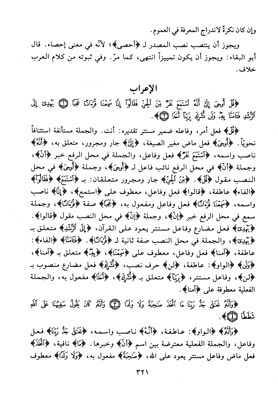 {قُلْ} فعل أمر، وفاعله ضمير مستتر تقديره: أنت. والجملة مستأنفة استئنافًا نحويًّا. {أُوحِيَ} فعل ماض مغير الصيغة، {إِلَيَّ} جار ومجرور، متعلق به، {أَنَّهُ} ناصب واسمه، {اسْتَمَعَ نَفَرٌ} فعل وفاعل، والجملة في محل الرفع خبر {أنّ}، وجملة {أنّ} في محل الرفع نائب فاعل لـ {أُوحِيَ}، وجملة {أُوحِيَ} في محل النصب مقول {قُلْ}. {مِنَ الْجِنِّ} جار ومجرور متعلقان: بـ {اسْتَمَعَ} {فَقَالُوا} {الفاء} عاطفة، {قالوا} فعل وفاعل، معطوف على {اسْتَمَعَ}، {إِنَّا} ناصب واسمه، {سَمِعْنَا قُرْآنًا} فعل وفاعل ومفعول به، {عَجَبًا} صفة {قُرْآنًا}، وجملة سمع في محل الرفع خبر {إنّ}، وجملة {إنّ} في محل النصب مقول {قالوا}. {يَهْدِي} فعل مضارع وفاعل مستتر يعود على القرآن، {إِلَى الرُّشْدِ} متعلق بـ {يَهْدِي}، والجملة في محل النصب صفة ثانية لـ {قُرْآنًا}. {فَآمَنَّا} {الفاء}: عاطفة، {آمنا} فعل وفاعل، معطوف على {سَمِعْنَا}، {بِهِ} متعلق بـ {آمنا}، {وَلَن} {الواو}: عاطفة، {لن} حرف نصب، {نُشْرِكَ} فعل مضارع منصوب بـ {لن}، وفاعل مستتر، {بِرَبِّنَا} متعلق بـ {نُشْرِكَ}، {أَحَدًا} مفعول به، والجملة الفعلية معطوفة على {آمنا}.