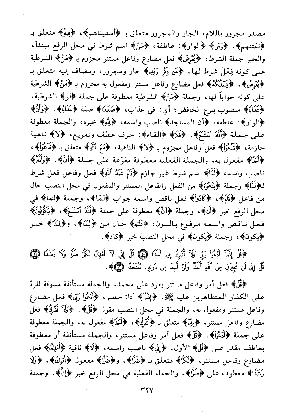 {قُلْ} فعل أمر وفاعل مستتر يعود على محمد، والجملة مستأنفة مسوقة للردّ على الكفار المتظاهرين عليه - صلى الله عليه وسلم -. {إِنَّمَا} أداة حصر، {أَدْعُو رَبِّي} فعل مضارع وفاعل مستتر ومفعول به، والجملة في محل النصب مقول {قُلْ}. {وَلَا أُشْرِكُ} فعل مضارع وفاعل مستتر، {بِهِ} متعلق بـ {أُشرِكُ}، {أَحَدًا} مفعول به، والجملة معطوفة على جملة {أَدْعُو}. {قُلْ} فعل أمر وفاعل مستتر، والجملة مستأنفة أو معطوفة بعاطف مقدر على {قُلْ} الأول. {إِنِّي} ناصب واسمه، {لَا} نافية {أَمْلِكُ} فعل مضارع وفاعل مستتر، {لَكُمْ} متعلق بـ {ضَرًّا}، و {ضَرًّا} مفعول {أَمْلِكُ}، {وَلَا رَشَدًا} معطوف على {ضَرًّا}، والجملة الفعلية في محل الرفع خبر {إنَّ}، وجملة