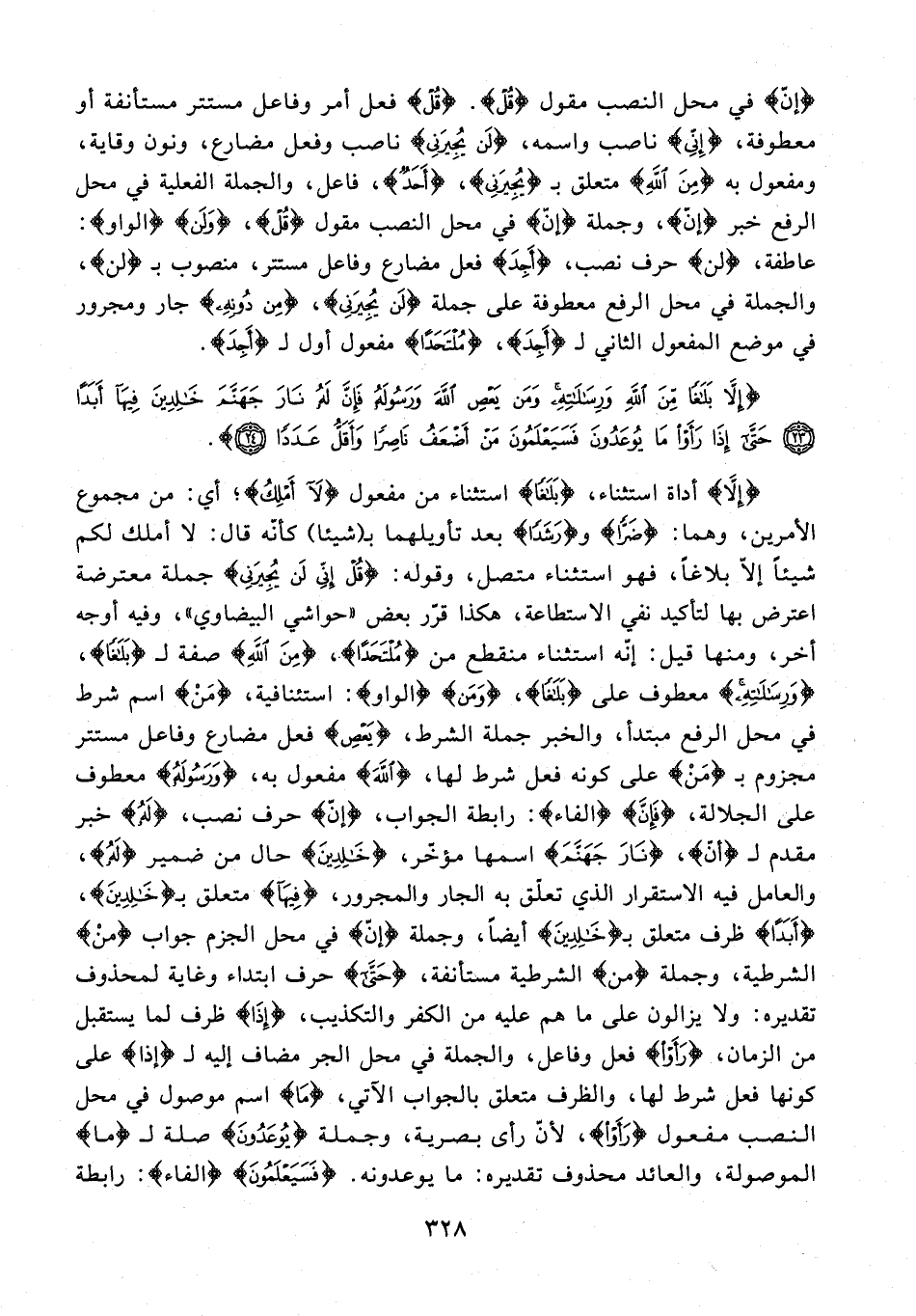 {إِلَّا} أداة استثناء، {بَلَاغًا} استثناء من مفعول {لَاَ أَمْلِكُ}؛ أي: من مجموع الأمرين، وهما: {ضَرًّا} و {رَشَدًا} بعد تأويلهما بـ (شيئا) كأنّه قال: لا أملك لكم شيئًا إلَّا بلاغًا، فهو استثناء متصل، وقوله: {قُلْ إِنِّي لَنْ يُجِيرَنِي} جملة معترضة اعترض بها لتأكيد نفي الاستطاعة، هكذا قرر بعض "حواشي البيضاوي"، وفيه أوجه أخر، ومنها قيل: إنه استثناء منقطع من {مُلْتَحَدًا}، {مِنَ اللَّهِ} صفة لـ {بَلَاغًا}، {وَرِسَالَاتِهِ} معطوف على {بَلَاغًا}، {وَمَن} {الواو}: استئنافية، {مَنْ} اسم شرط في محل الرفع مبتدأ، والخبر جملة الشرط، {يَعْصِ} فعل مضارع وفاعل مستتر مجزوم بـ {مَنْ} على كونه فعل شرط لها، {اللَّهِ} مفعول به، {وَرَسُولَهُ} معطوف على الجلالة، {فَإِنَّ} {الفاء}: رابطة الجواب، {إنّ} حرف نصب، {لَهُ} خبر مقدم لـ {أن}، {نَارَ جَهَنَّمَ} اسمها مؤخر، {خَالِدِينَ} حال من ضمير {لَهُ}، والعامل فيه الاستقرار الذي تعلق به الجار والمجرور، {فِيهَا} متعلق بـ {خَالِدِينَ}، {أَبَدًا} ظرف متعلق بـ {خَالِدِينَ} أيضًا، وجملة {إنّ} في محل الجزم جواب {من} الشرطية، وجملة {من} الشرطية مستأنفة، {حَتَّى} حرف ابتداء وغاية لمحذوف تقديره: ولا يزالون على ما هم عليه من الكفر والتكذيب، {إِذَا} ظرف لما يستقبل من الزمان، {رَأَوْا} فعل وفاعل، والجملة في محل الجر مضاف إليه لـ {إذا} على كونها فعل شرط لها، والظرف متعلق بالجواب الآتي، {مَا} اسم موصول في محل النصب مفعول {رَأَوْا}؛ لأنّ رأى بصرية، وجملة {يُوعَدُونَ} صلة لـ {ما} الموصولة، والعائد محذوف تقديره: ما يوعدونه. {فَسَيَعْلَمُونَ} {الفاء}: رابطة