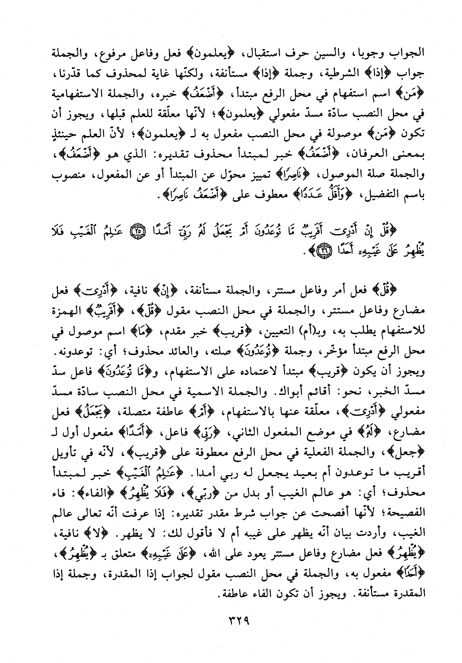 {قُلْ} فعل أمر وفاعل مستتر، والجملة مستأنفة، {إن} نافية، {أَدْرِى} فعد مضارع وفاعل مستتر، والجملة في محل النصب مقول {قل}، {أَقَرِيبٌ} الهمزة للاستفهام يطلب به، وبـ (أم) التعيين، {قريب} خبر مقدم، {مَا} اسم موصول في محل الرفع مبتدأ مؤخّر، وجملة {توُعَدُونَ} صلته، والعائد محذوف؛ أي: توعدونه. ويجوز أن يكون {قريب} مبتدأ لاعتماده على الاستفهام، و {مَا تُوعَدُونَ} فاعل سدّ مسدّ الخبر، نحو: أقائم أبواك. والجملة الاسمية في محل النصب سادّة مسدّ مفعولي {أَدْرِى}، معّلقة عنها بالاستفهام، {أَمْ} عاطفة متصة، {يَجْعَلُ} فعل مضارع، {لَهُ} في موضع المفعول الثاني، {رَبِّي} فاعل، {أَمَدًا} مفعول أول لـ {جعل}، والجملة الفعلية في محل الرفع معطوفة على {قريب}؛ لأنّه في تأويل أقريب ما توعدون أم بعيد يجعل له ربي أمدا. {عَالِمُ الْغَيْبِ} خبر لمبتدأ محذوف، أي: هو عالم الغيب أو بدل من {ربّي}، {فَلَا يُظْهِرُ} {الفاء}: فاء الفصيحة؛ لأنها أفصحت عن جواب شوط مقدر تقديره: إذا عرفت أنّه تعالى عالم الغيب، وأردت بيان أنّه يظهر على غيبه أم لا فأقول لك: لا يظهر. {لا} نافية، {يُظْهِرُ} فعل مضارع وفاعل مستتر يعود على الله، {عَلَى غَيْبِهِ} متعلق بـ {يُظْهِرُ}، {أَحَدًا} مفعول به، والجملة في محل النصب مقول لجواب إذا المقدرة، وجملة إذا المقدرة مستأنفة. ويجوز أن تكون الفاء عاطفة.