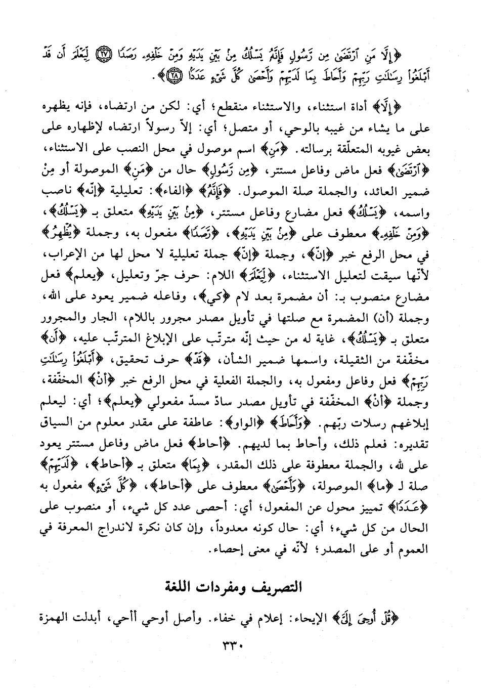 {إِلَّا} أداة استثناء، والاستثناء منقطع؛ أي: لكن من ارتضاه، فإنه يظهره على ما يشاء من غيبه بالوحي، أو متصل؛ أي: إلّا رسولًا ارتضاه لإظهاره على بعض غيوبه المتعلّقة برسالته. {مَنِ} اسم موصول في محل النصب على الاستثناء، {ارْتَضَى} فعل ماض وفاعل مستتر، {مِنْ رَسُولٍ} حال من {مَنِ} الموصولة أو مِنْ ضمير العائد، والجملة صلة الموصول. {فَإِنَّهُ} {الفاء}: تعليلية {إنه} ناصب واسمه، {يَسْلُكُ} فعل مضارع وفاعل مستتر، {مِنْ بَيْنِ يَدَيْهِ} متعلق بـ {يَسْلُكُ}، {وَمِنْ خَلْفِهِ} معطوف على {مِنْ بَيْنِ يَدَيْهِ}، {رَصَدًا} مفعول به، وجملة {يُظْهِرُ} في محل الرفع خبر {إنّ}، وجملة {إنّ} جملة تعليلية لا محل لها من الإعراب، لأنها سيقت لتعليل الاستثناء، {لِيَعْلَمَ} اللام: حرف جرّ وتعليل، {يعلم} فعل مضارع منصوب بـ: أن مضمرة بعد لام {كي}، وفاعله ضمير يعود على الله، وجملة (أن) المضمرة مع صلتها في تأويل مصدر مجرور باللام، الجار والمجرور متعلق بـ {يَسْلُكُ}، غاية له من حيث إنّه مترتب على الإبلاغ المترتّب عليه، {أَن} مخفّفة من الثقيلة، واسمها ضمير الشأن، {قَدْ} حرف تحقيق، {أَبْلَغُوا رِسَالَاتِ رَبِّهِمْ} فعل وفاعل ومفعول به، والجملة الفعلية في محل الرفع خبر {أنْ} المخفّفة، وجملة {أنْ} المخقفة في تأويل مصدر سادّ مسدّ مفعولي {يعلم}؛ أي: ليعلم إبلاغهم رسلات ربّهم. {وَأَحَاطَ} {الواو}: عاطفة على مقدر معلوم من السياق تقديره: فعلم ذلك، وأحاط بما لديهم. {أحاط} فعل ماض وفاعل مستتر يعود على الله، والجملة معطوفة على ذلك المقدر، {بِمَا} متعلق بـ {أحاط}، {لَدَيْهِمْ} صلة لـ {ما} الموصولة، {وَأَحْصَى} معطوف على {أحاط}، {كُلَّ شَيْءٍ} مفعول به {عَدَدًا}؛ تمييز محول عن المفعول؛ أي: أحصى عدد كل شيء، أو منصوب على الحال من كل شيء؛ أي: حال كونه معدودًا، وإن كان نكرة لاندراج المعرفة في العموم أو على المصدر؛ لأنه في معنى إحصاء.