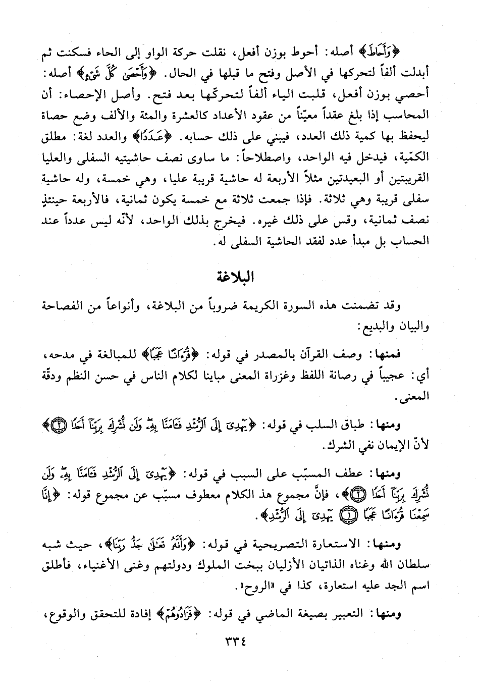 {وَأَحَاطَ} أصله: أحوط بوزن أفعل، نقلت حركة الواو إلى الحاء فسكنت ثم أبدلت ألفًا لتحركها في الأصل وفتح ما قبلها في الحال. {وَأَحْصَى كُلَّ شَيْءٍ} أصله: أحصي بوزن أفعل، قلبت الياء ألفًا لتحركها بعد فتح. وأصل الإحصاء: أن المحاسب إذا بلغ عقدًا معيّنًا من عقود الأعداد كالعشرة والمئة والألف وضع حصاة ليحفظ بها كمية ذلك العدد، فيبني على ذلك حسابه. {عَدَدًا} والعدد لغة: مطلق الكمية، فيدخل فيه الواحد، واصطلاحًا: ما ساوى نصف حاشيتيه السفلى والعليا القريبتين أو البعيدتين مثلًا الأربعة له حاشية قريبة عليا، وهي خمسة، وله حاشية سفلى قريبة وهي ثلاثة. فإذا جمعت ثلاثة مع خمسة يكون ثمانية، فالأربعة حينئذٍ نصف ثمانية، وقس على ذلك غيره. فيخرج بذلك الواحد، لأنّه ليس عددًا عند الحساب بل مبدأ عدد لفقد الحاشية السفلى له.