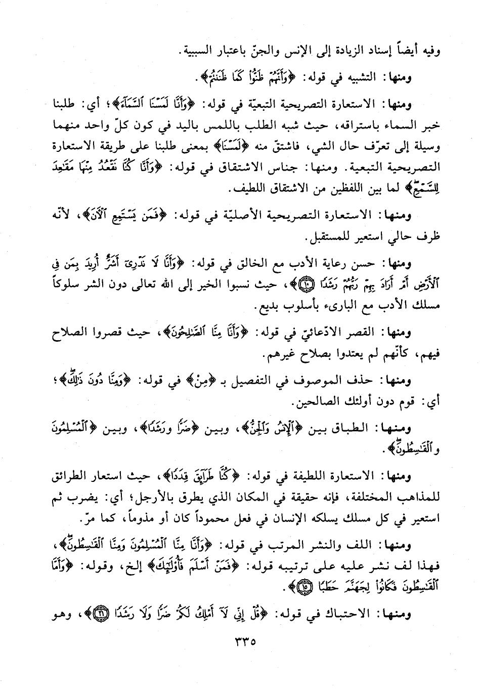 ومنها: اللف والنشر المرتب في قوله: {وَأَنَّا مِنَّا الْمُسْلِمُونَ وَمِنَّا الْقَاسِطُونَ}، فهذا لف نشر عليه على ترتيبه قوله: {فَمَنْ أَسْلَمَ فَأُولَئِكَ} إلخ، وقوله: {وَأَمَّا الْقَاسِطُونَ فَكَانُوا لِجَهَنَّمَ حَطَبًا (15)}.