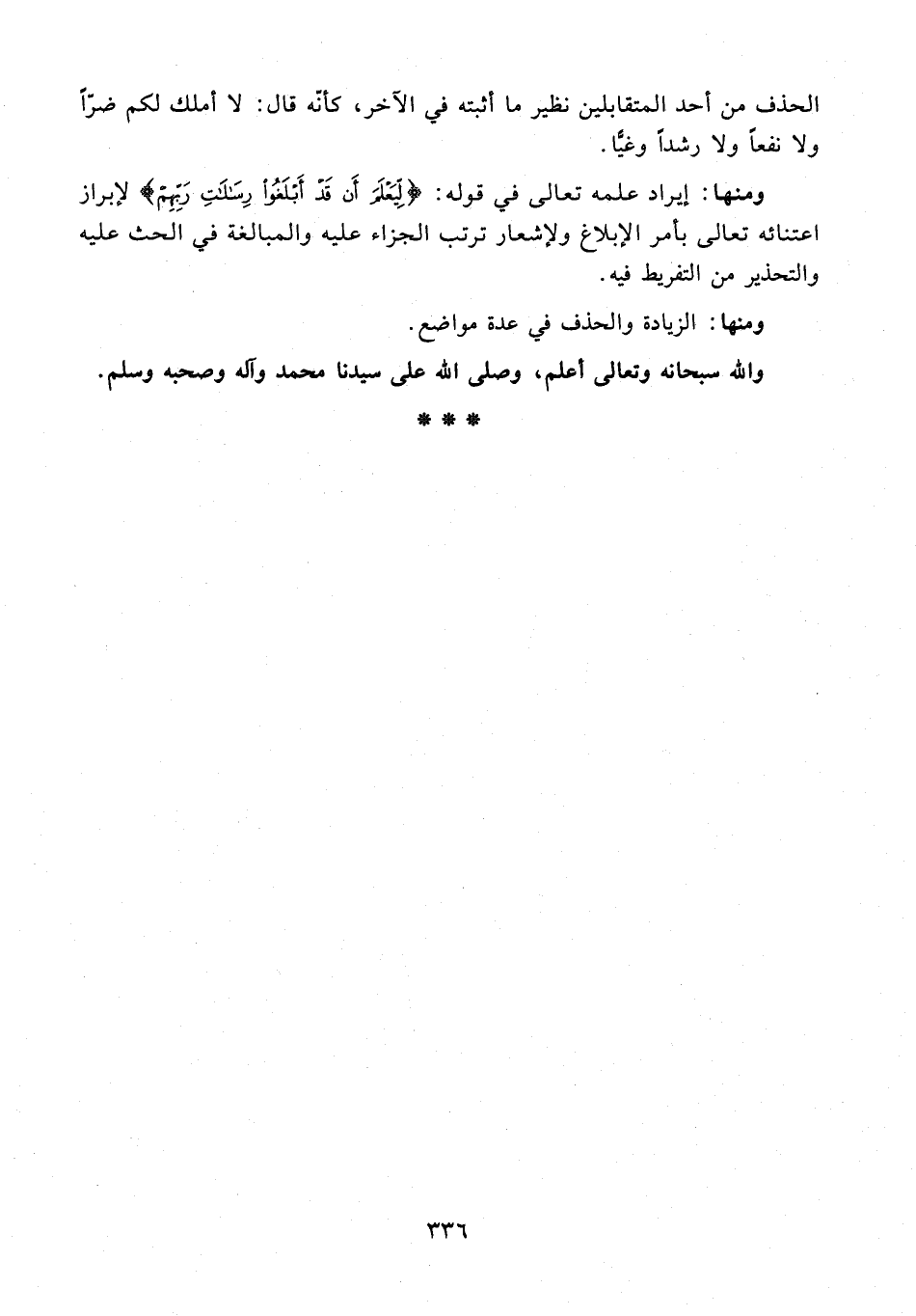 الحذف من أحد المتقابلين نظير ما أثبته في الآخر، كأنّه قال: لا أملك لكم ضرًّا ولا نفعًا ولا رشدًا وغيًّا.