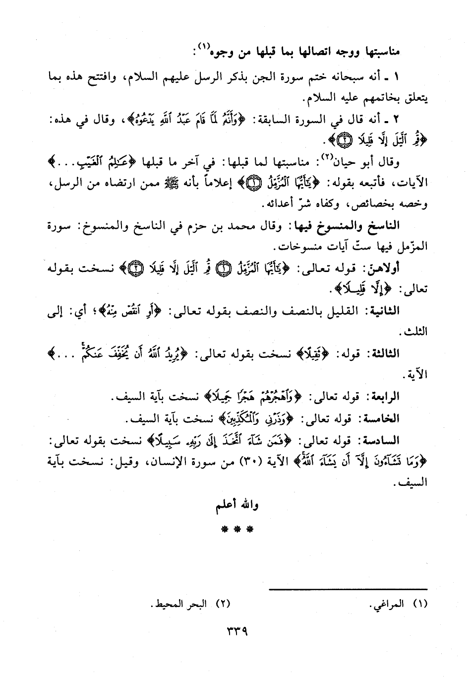 وقال أبو حيان (¬2): مناسبتها لما قبلها: في آخر ما قبلها {عَالِمُ اَلغَيبِ ...} الآيات، فأتبعه بقوله: {يَا أَيُّهَا الْمُزَّمِّلُ (1)} إعلامًا بأنه - صلى الله عليه وسلم - ممن ارتضاه من الرسل، وخصه بخصائص، وكفاه شرّ أعدائه.