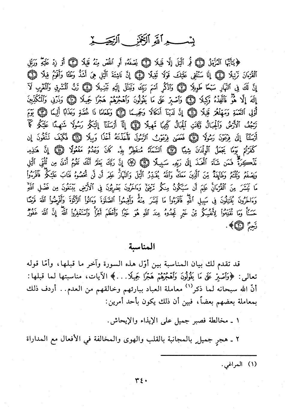 قد تقدم لك بيان المناسبة بين أوّل هذه السورة وآخر ما قبلها، وأمّا قوله تعالى: {وَاصْبِرْ عَلَى مَا يَقُولُونَ وَاهْجُرْهُمْ هَجْرًا جَمِيلًا ...} الآيات، مناسبتها لما قبلها: أنّ الله سبحانه لما ذكر (¬1) معاملة العباد ببارئهم وخالقهم من العدم .. أردف ذلك بمعاملة بعضهم بعضًا، فبين أن ذلك يكون بأحد أمرين: