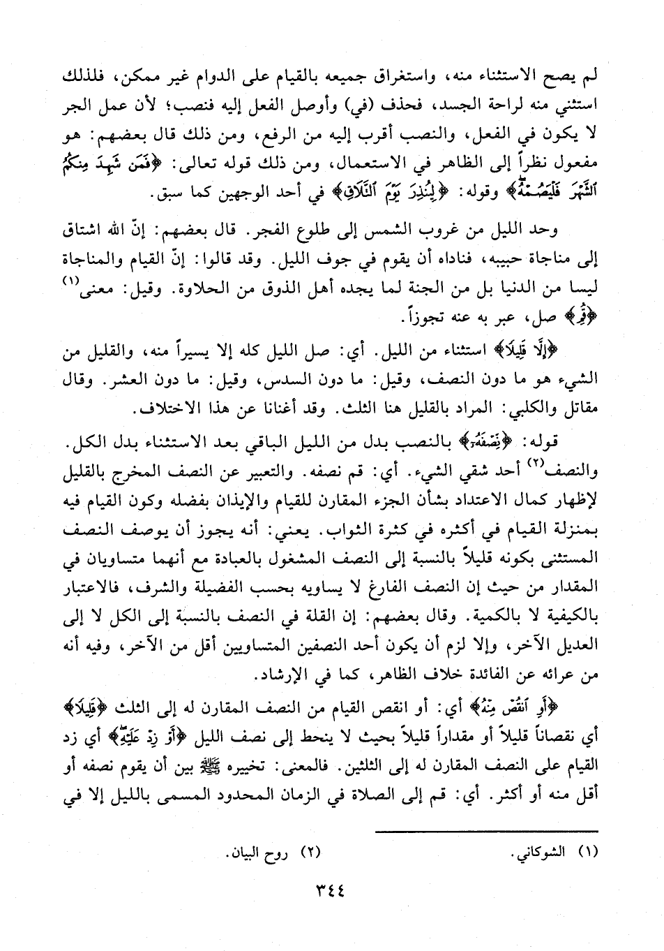 لم يصح الاستثناء منه، واستغراق جميعه بالقيام على الدوام غير ممكن، فلذلك استثني منه لراحة الجسد، فحذف (في) وأوصل الفعل إليه فنصب؛ لأن عمل الجر لا يكون في الفعل، والنصب أقرب إليه من الرفع، ومن ذلك قال بعضهم: هو مفعول نظرًا إلى الظاهر في الاستعمال، ومن ذلك قوله تعالى: {فَمَنْ شَهِدَ مِنْكُمُ الشَّهْرَ فَلْيَصُمْهُ} وقوله: {لِيُنْذِرَ يَوْمَ التَّلَاقِ} في أحد الوجهين كما سبق.