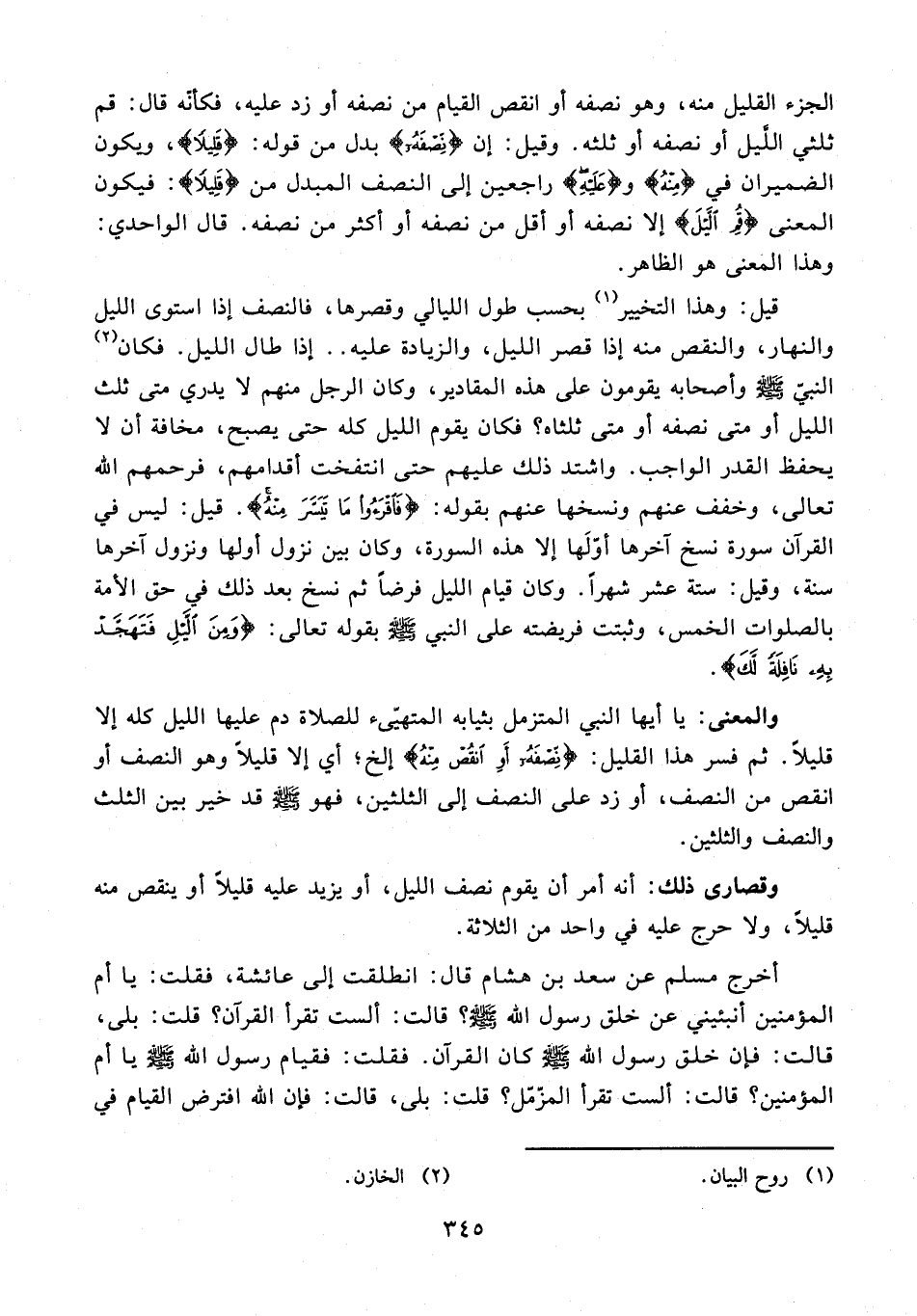 أخرج مسلم عن سعد بن هشام قال: انطلقت إلى عائشة، فقلت: يا أم المؤمنين أنبئيني عن خلق رسول الله - صلى الله عليه وسلم -؟ قالت: ألست تقرأ القرآن؟ قلت: بلى، قالت: فإن خلق رسول الله - صلى الله عليه وسلم - كان القرآن. فقلت: فقيام رسول الله - صلى الله عليه وسلم - يا أم المؤمنين؟ قالت: ألست تقرأ المزّمّل؟ قلت: بلى، قالت: فإن الله افترض القيام في
