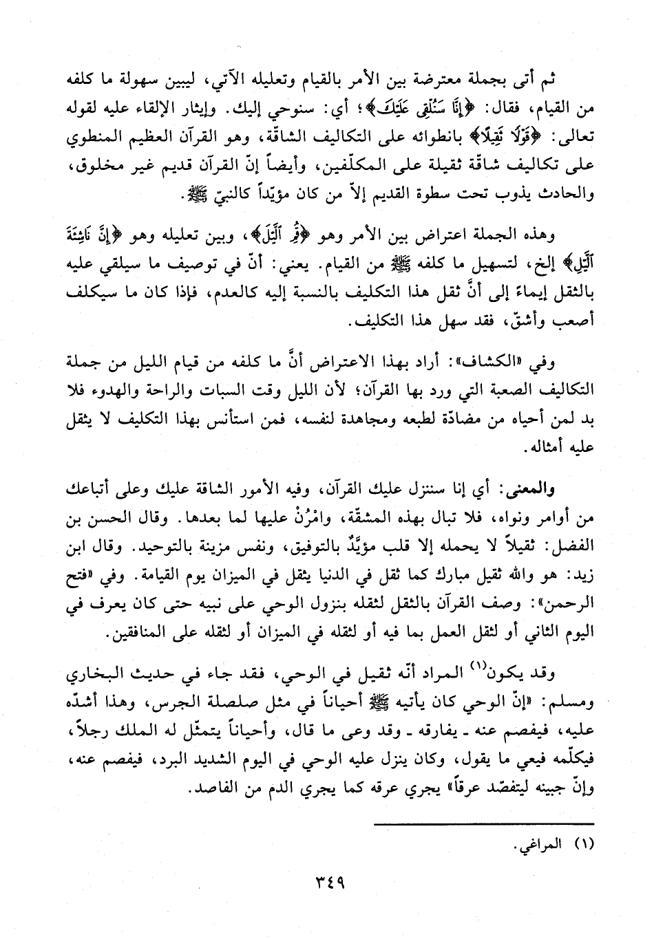 ثم أتى بجملة معترضة بين الأمر بالقيام وتعليله الآتي، ليبين سهولة ما كلفه من القيام، فقال: {إِنَّا سَنُلْقِي عَلَيْكَ}؛ أي: سنوحي إليك. وإيثار الإلقاء عليه لقوله تعالى: {قَوْلًا ثَقِيلًا} بانطوائه على التكاليف الشاقّة، وهو القرآن العظيم المنطوي على تكاليف شاقّة ثقيلة على المكلّفين، وأيضًا إنّ القرآن قديم غير مخلوق، والحادث يذوب تحت سطوة القديم إلّا من كان مؤيّدًا كالنبيّ - صلى الله عليه وسلم -.