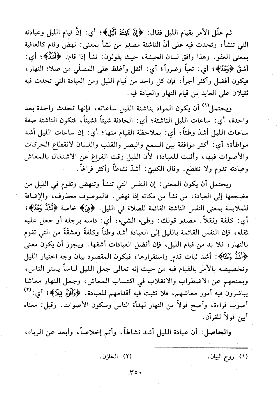 ويحتمل أن يكون المعنى: إن النفس التي تنشأ وتنهض وتقوم في الليل من مضجعها إلى العبادة، من نشأ من مكانه إذا نهض. فالموصوف محذوف، والإضافة للملابسة بمعنى النفس الناشئة القائمة للصلاة في الليل. {هِيَ} خاصة {أَشَدُّ وَطْئًا}؛ أي: كلفة وثقلًا. مصدر قولك: وطىء الشيء؛ أي: داسه برجله أو جعل عليه ثقله، فإن النفس القائمة بالليل إلى العبادة أشد وطئًا وكلفةً ومشقةً من التي تقوم بالنهار، فلا بد من قيام الليل، فإن أفضل العبادات أشقها. ويجوز أن يكون معنى {أَشَدُّ وَطْئًا}: أشد ثبات قدمٍ واستقرارها، فيكون المقصود بيان وجه اختيار الليل وتخصيصه بالأمر بالقيام فيه من حيث إنه تعالى جعل الليل لباسًا يستر الناس، ويمنعهم عن الاضطراب والانقلاب في اكتساب المعاش، وجعل النهار معاشا يباشرون فيه أمور معاشهم، فلا تثبت فيه أقدامهم للعبادة. {وَأَقْوَمُ قِيلًا}؛ أي: (¬2) أصوب قراءة، وأصح قولًا من النهار لهدأة الناس وسكون الأصوات. وقيل: معناه أبين قولًا للقرآن.